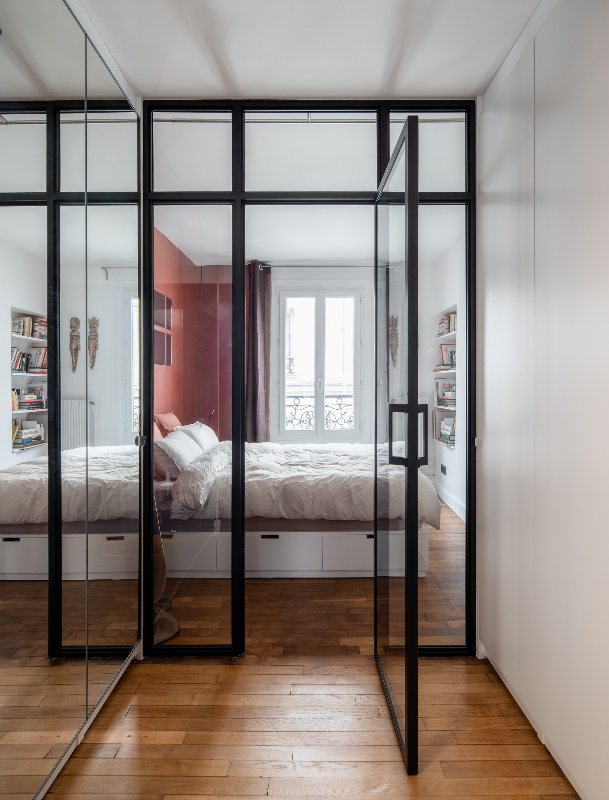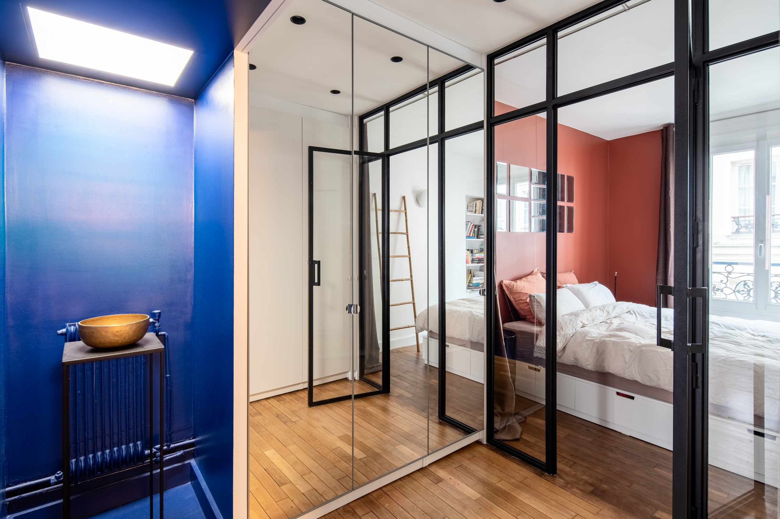 Ce puits de lumière était dans l’ancienne salle de bains et prend désormais tout son sens ici. Un rail de LED l’entoure, éclairant la zone la nuit. Pour le mettre en valeur, un petit meuble haut avec un bol tibétain a été placé sous la fenêtre de toit. La porte à gauche mène à la salle de bains et, à droite, le couloir ouvre sur le dressing prolongé par la chambre.