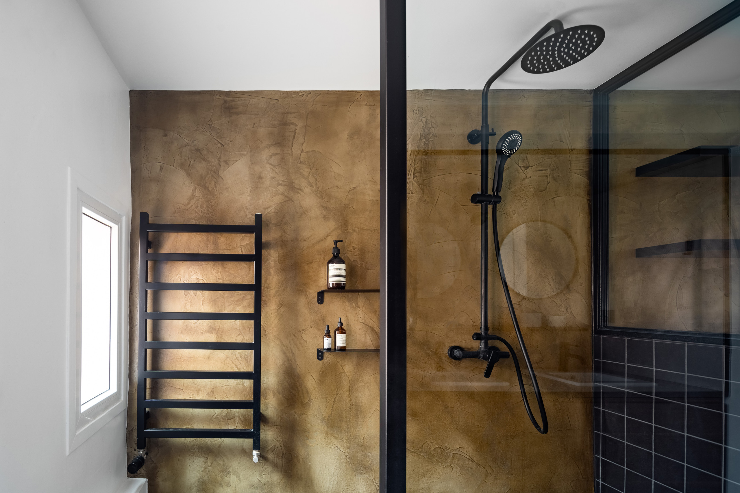 En face, du côté de l’immense douche, l’utilisation du noir pour la robinetterie, le carrelage et le sèche-serviettes à gaz demeure cohérente avec le décor global. Les parois en béton ciré aspect bronze, marquées par des coups de taloche, font écho au béton du plan vasque.