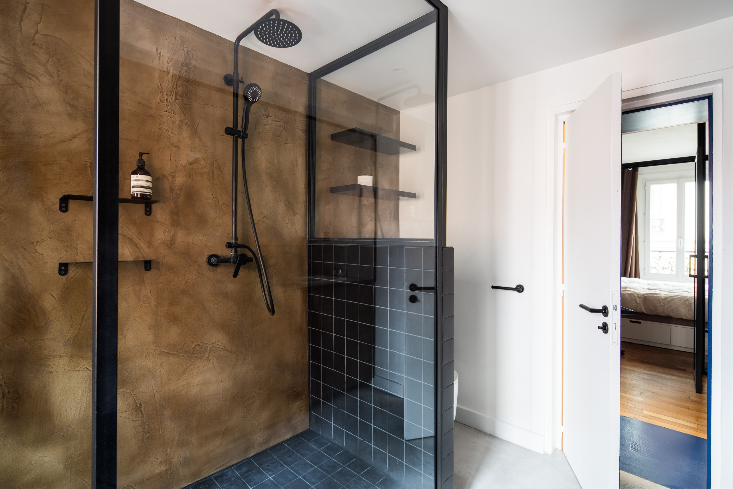 La cloison de douche de 120 x 225 cm – un challenge pour la monter dans l’escalier de l’immeuble ! – est entourée d’un cadre acier noir sur mesure, tout comme la niche côté plan vasque… Aucun détail n’a été laissé au hasard !