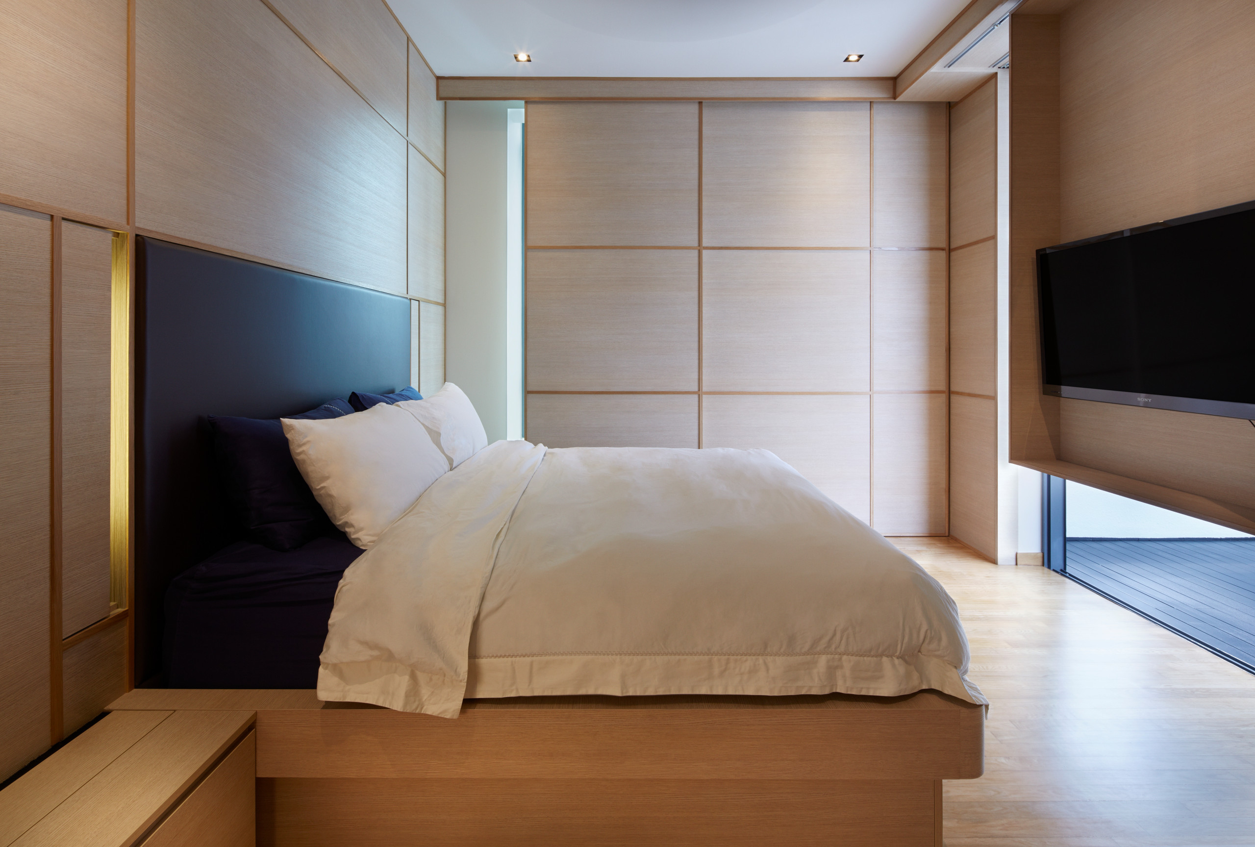 Le look épuré du minimalisme japonais se retrouve jusque dans la chambre parentale, avec un lit plateforme à la tête recouverte de cuir. En face, un panneau coulissant dissimule la télévision lorsqu’elle n’est pas utilisée.