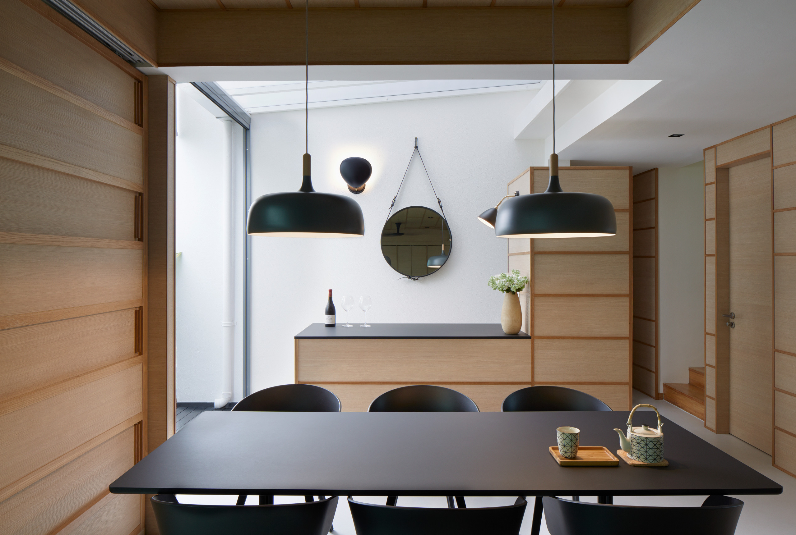 Une attention particulière a été portée à la palette de couleurs utilisée. Des suspensions de métal noir flottent au-dessus d’une table assorties à des chaises de la même teinte. L’ensemble contraste avec le bois clair utilisé dans la pièce.