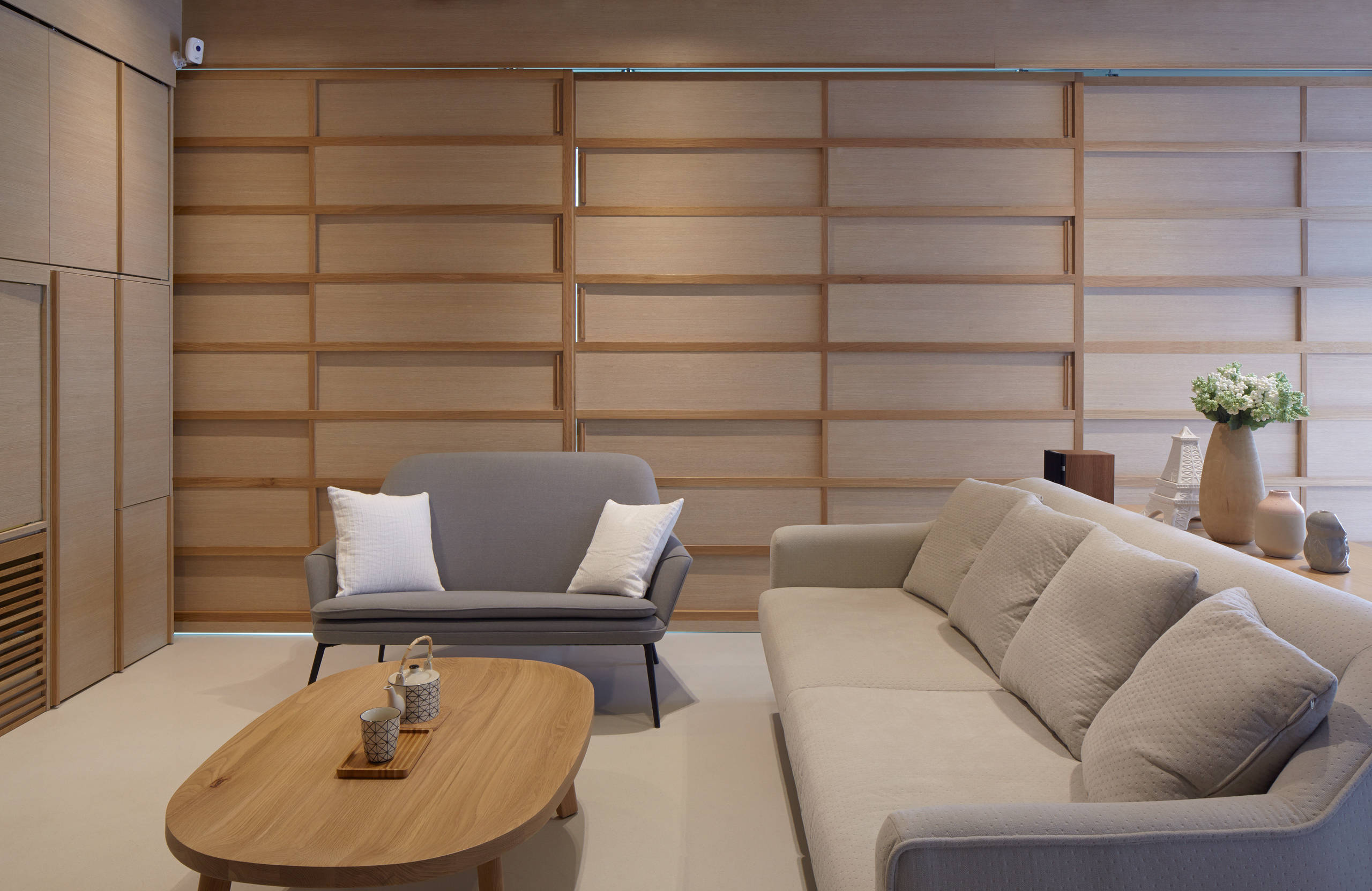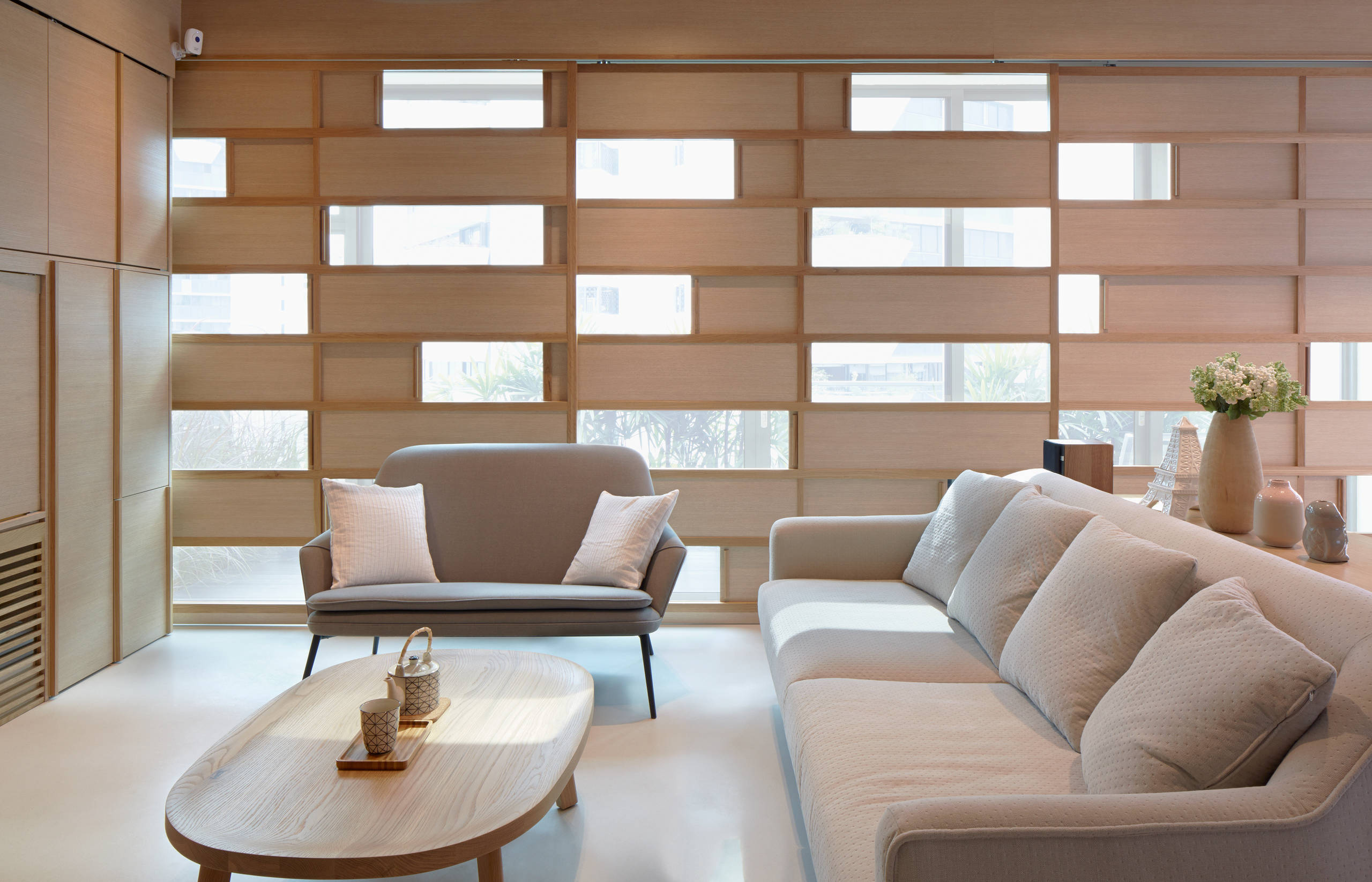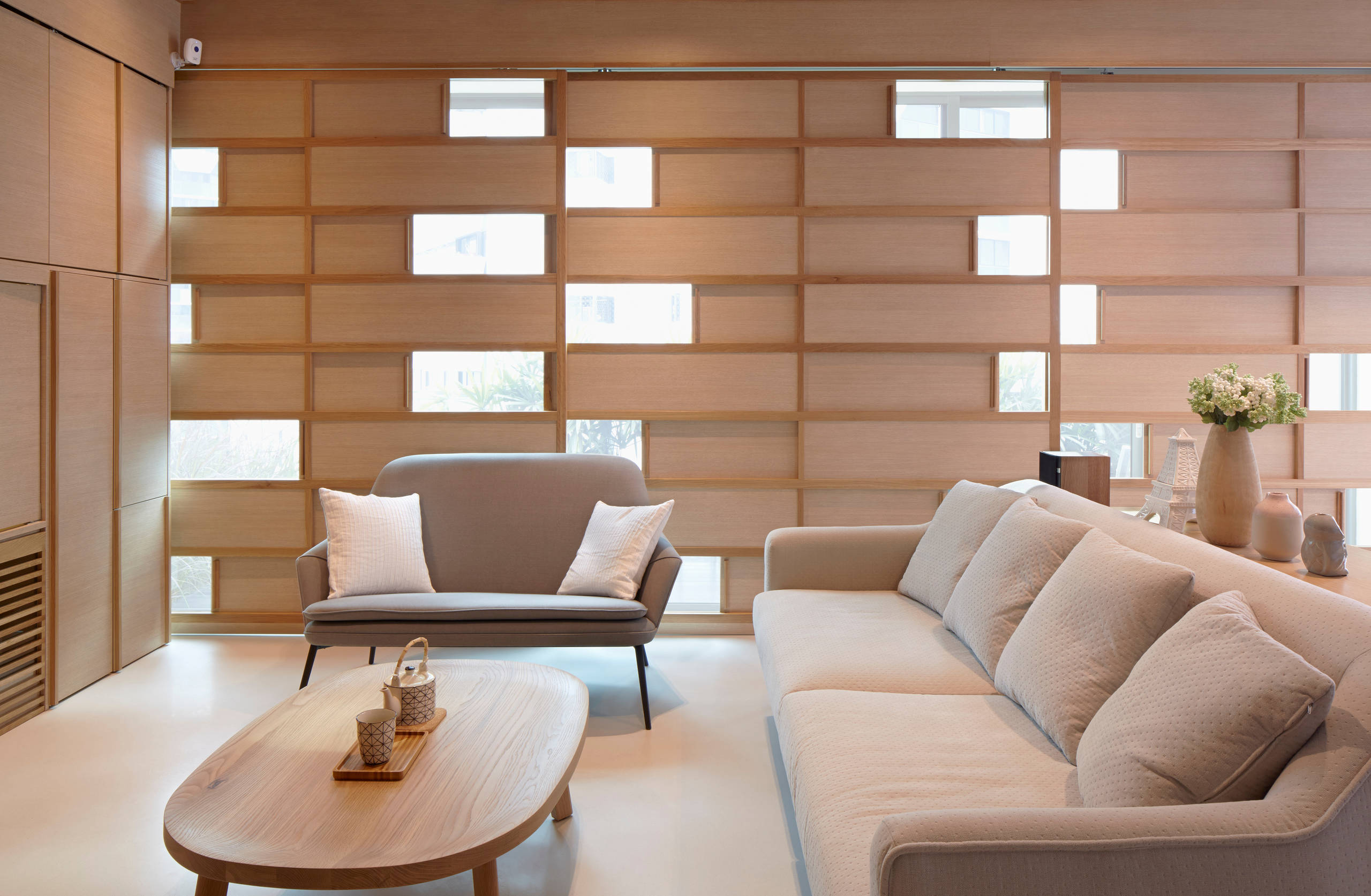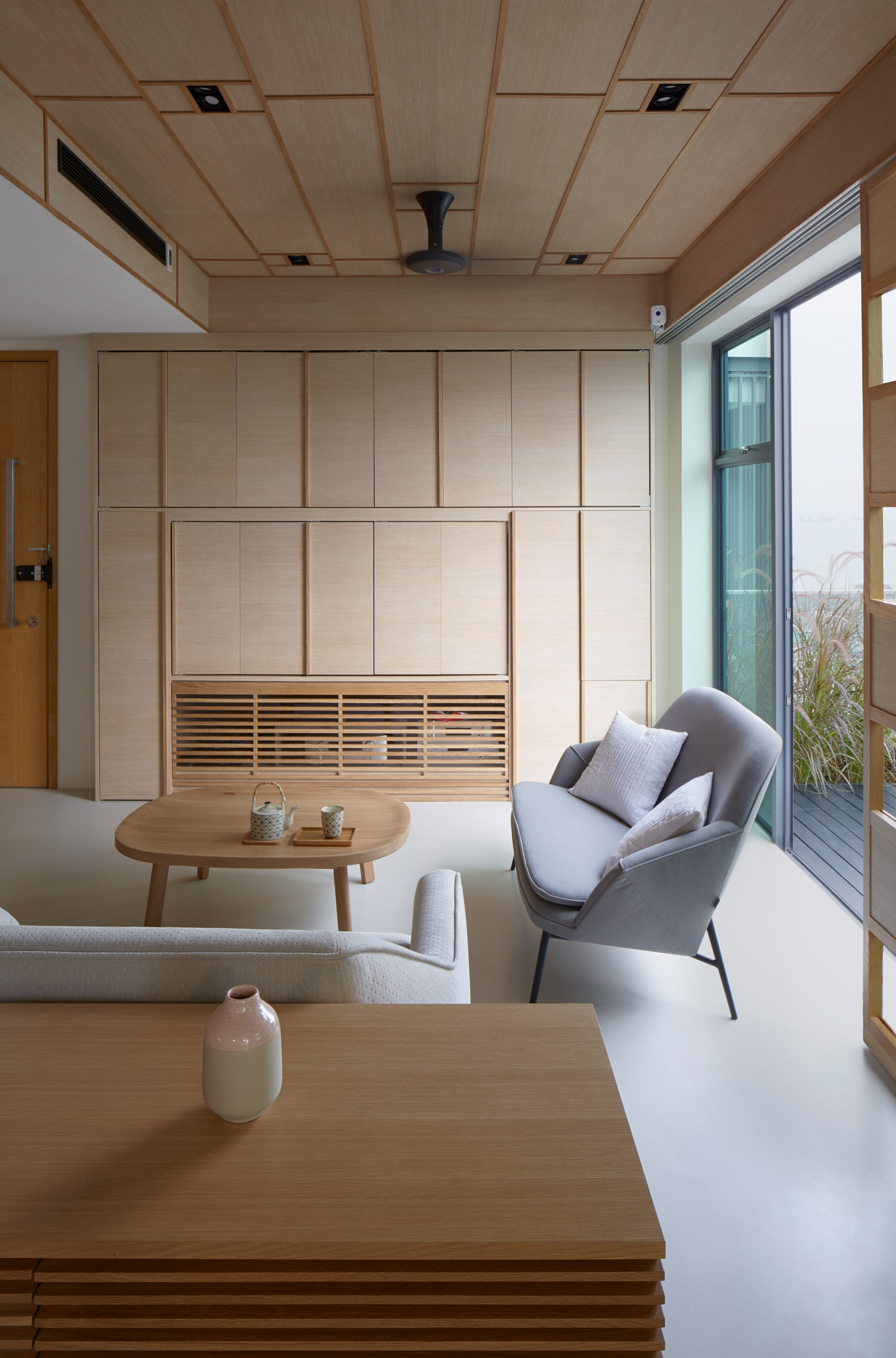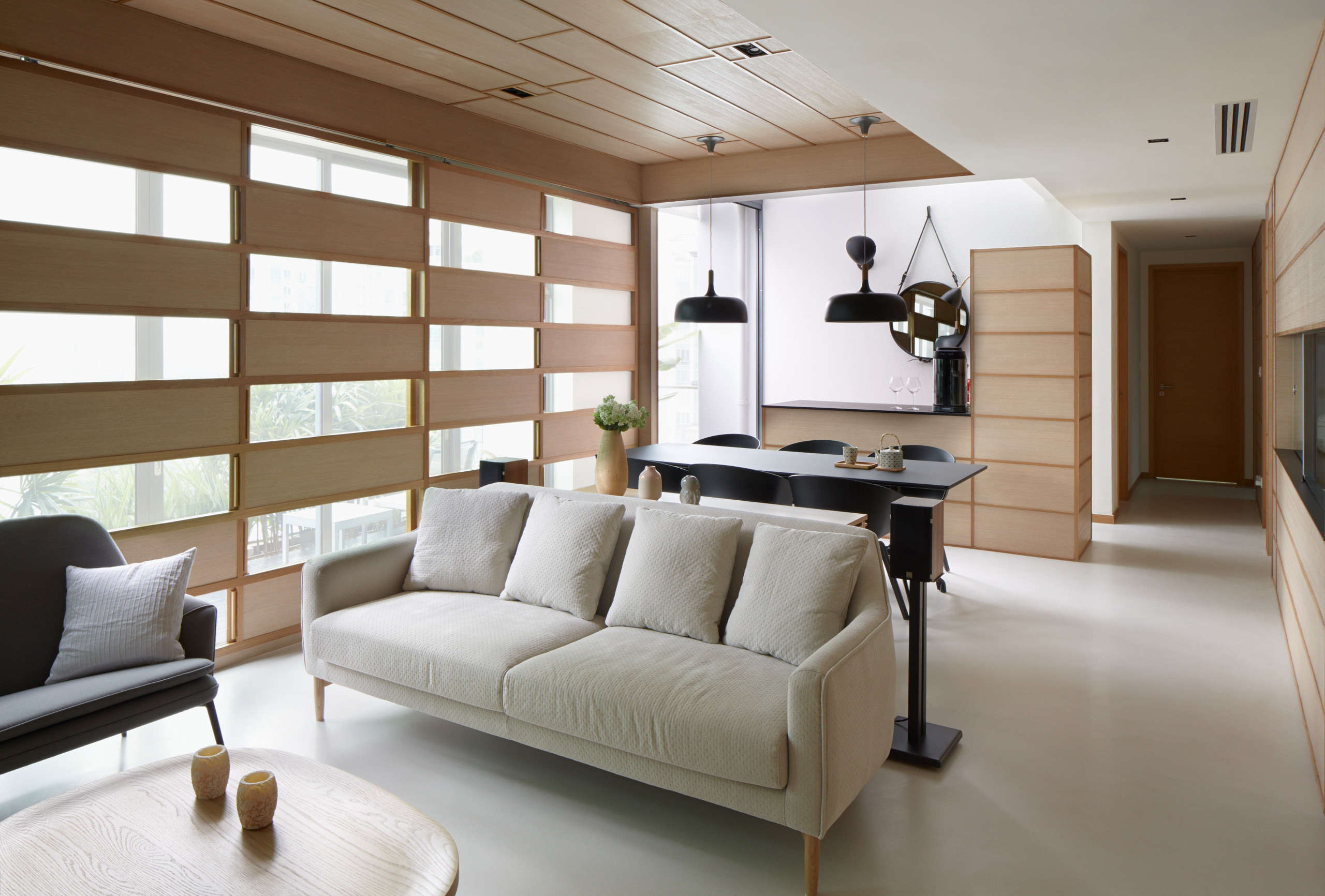 Le mobilier aux lignes sobres et aux tons neutres, dont la table basse en chêne massif du designer Nathan Yong, a été sélectionné afin de renforcer la cohérence du design. L’espace n’est orné que de quelques accessoires, conformément au style minimaliste.