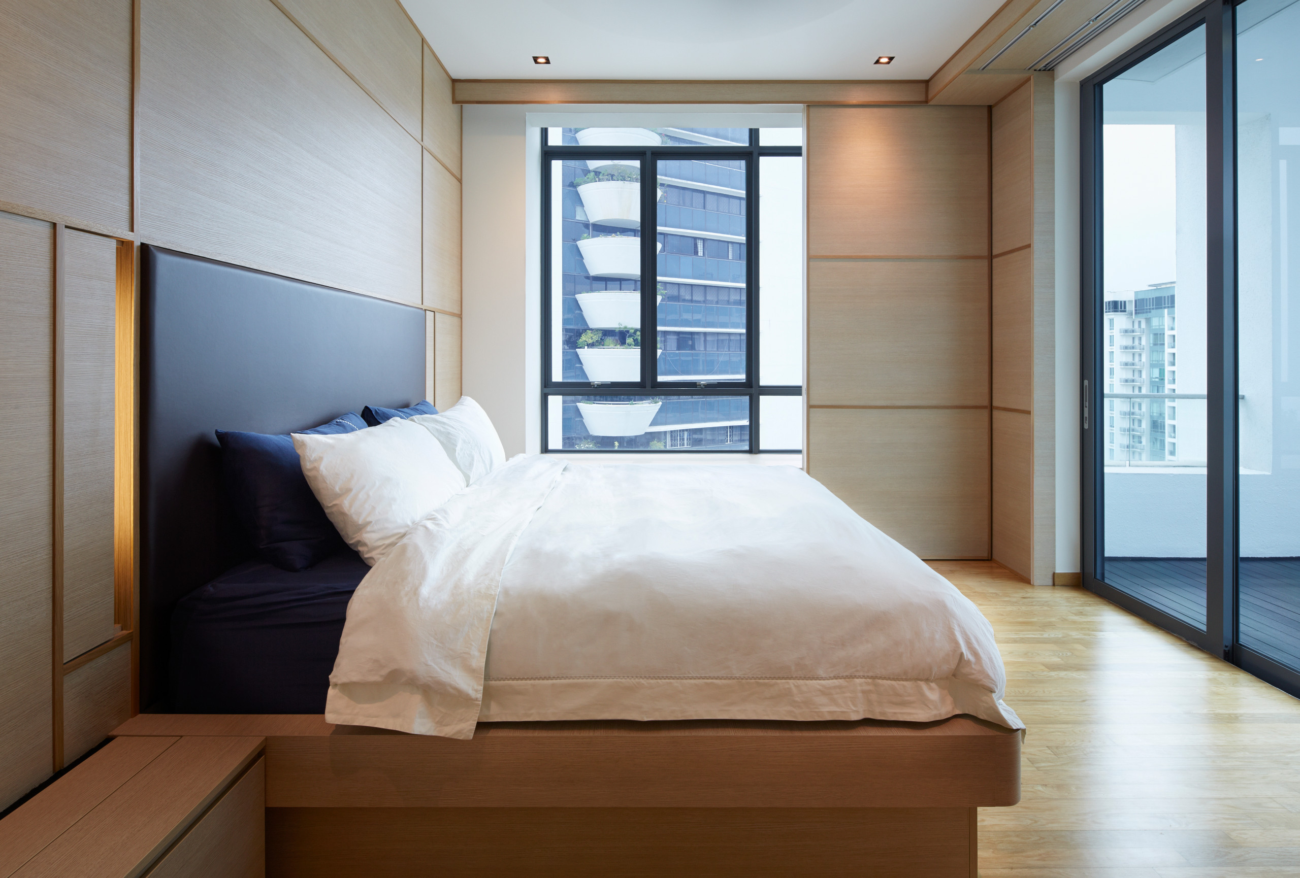 « Premier challenge du premier : l’orientation sud-ouest du penhouse, avec un abondant soleil couchant, une copropriété imposante tout juste devant et une vue fantastique sur la mer. Nous avons donc adopté une approche architecturale et redéfini les frontières entre l’appartement et son environnement », explique l’architecte Quck Zhong Yi de chez asolidplan.