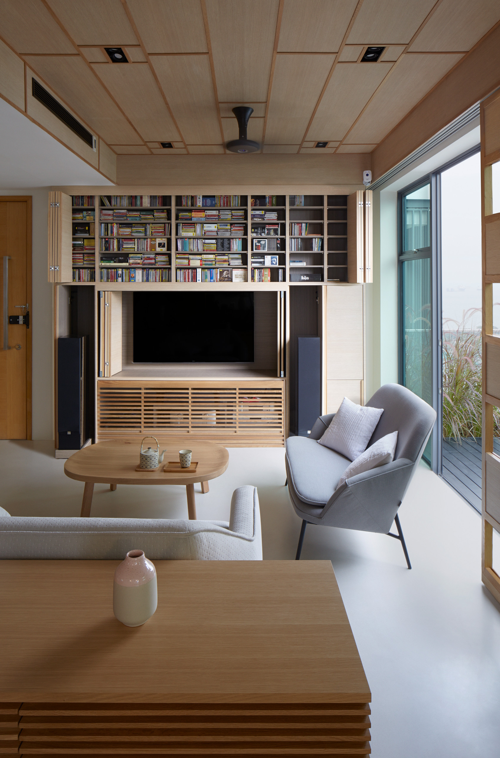 Les portes pliables révèlent la télévision et la vaste collection de CD de musique classique des propriétaires. Les haut-parleurs fixés à une base coulissante peuvent glisser vers l’avant lorsqu’ils sont utilisés.