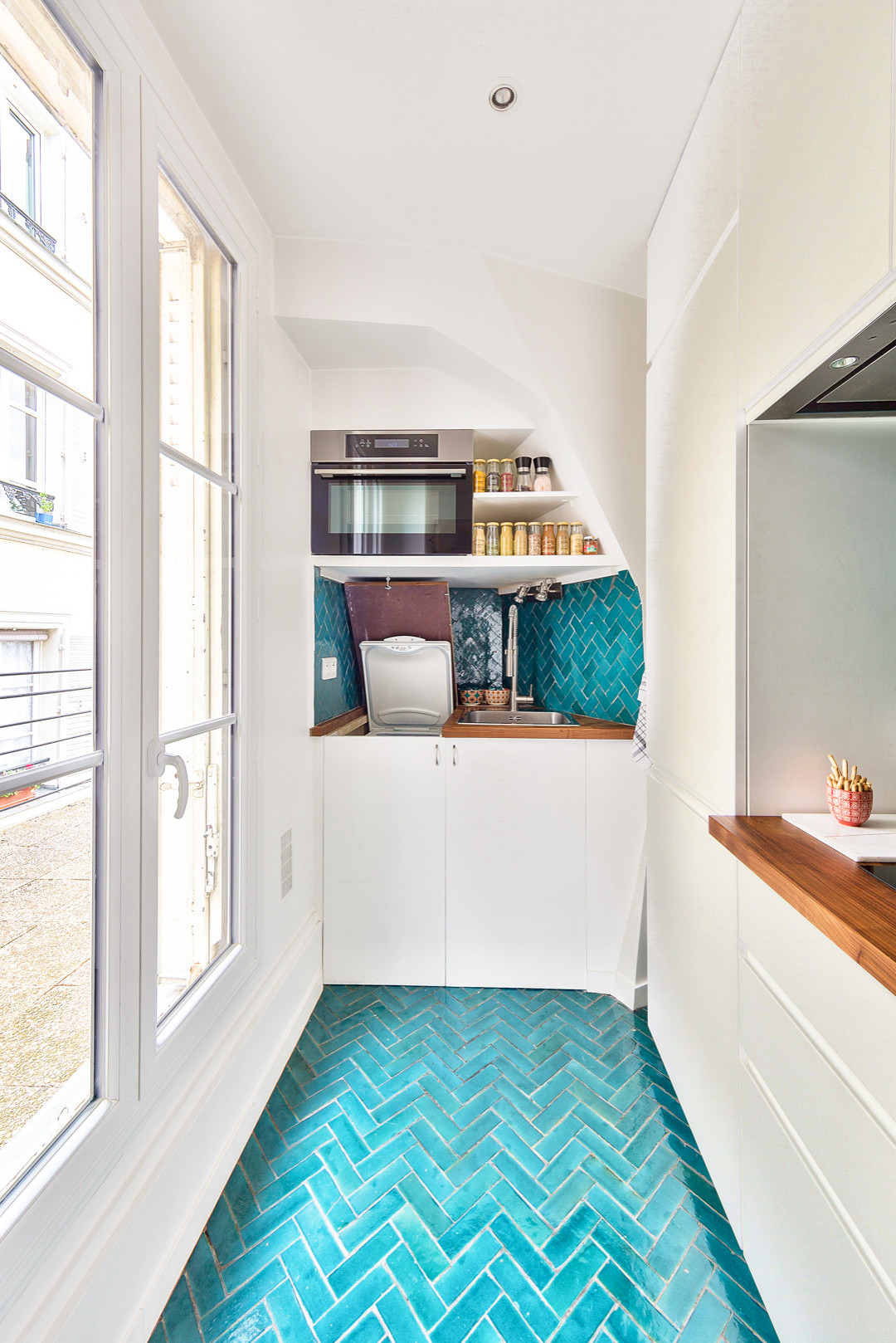 Au bout du couloir, apparaît la cuisine immaculée, littéralement sublimée par les zelliges bleu pétrole posés sur le sol et en crédence, avec un traitement différant selon les supports. Les plans de travail en bois exotique réchauffent également le tout et répondent à l’atmosphère de la pièce voisine.