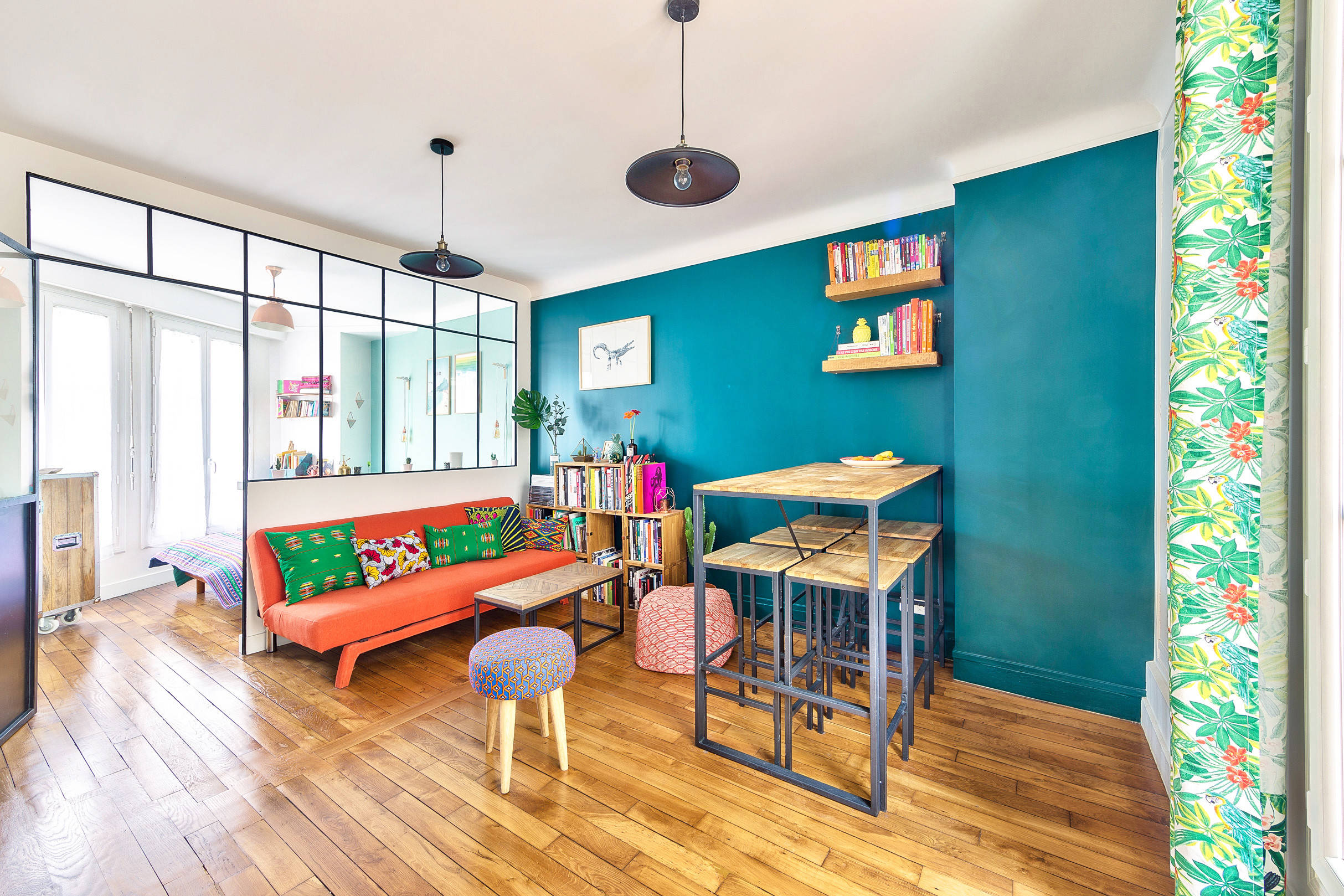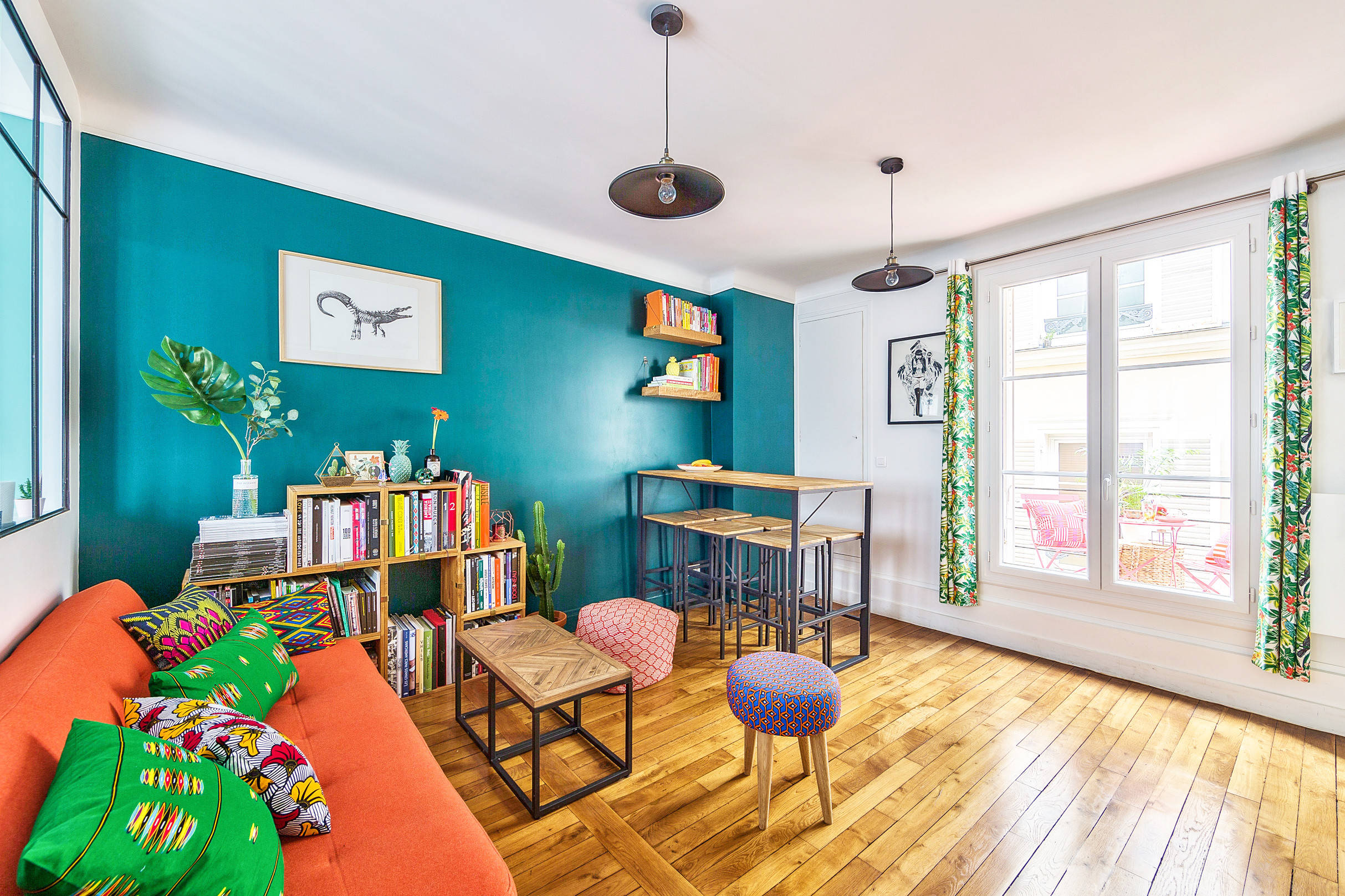 Les jeunes propriétaires de cet appartement, situé près du métro Blanche dans le IXᵉ arrondissement de Paris, ont littéralement flashé sur ce deux-pièces avec balcon et terrasse. Son état était plutôt correct, mais il était mal agencé, notamment au niveau des pièces d’eau, et la déco méritait un changement radical. Leur souhait, pour ce premier achat, était de métamorphoser leur habitation, au troisième étage d’un petit immeuble, en un petit nid douillet fonctionnel et joyeux. L’architecte d’intérieur Margaux Carnevali, fondatrice de l’agence Neva architecture intérieure à Paris, a joliment repensé la décoration et les pièces de l’appartement, notamment la cuisine, la salle de bains et le salon qu’elle a agrandis. Inspirée par le goût des propriétaires pour les voyages et l’exotisme, elle a ajouté des touches ethniques et tropicales qui confèrent peps et gaieté à ce projet lumineux. Visite.