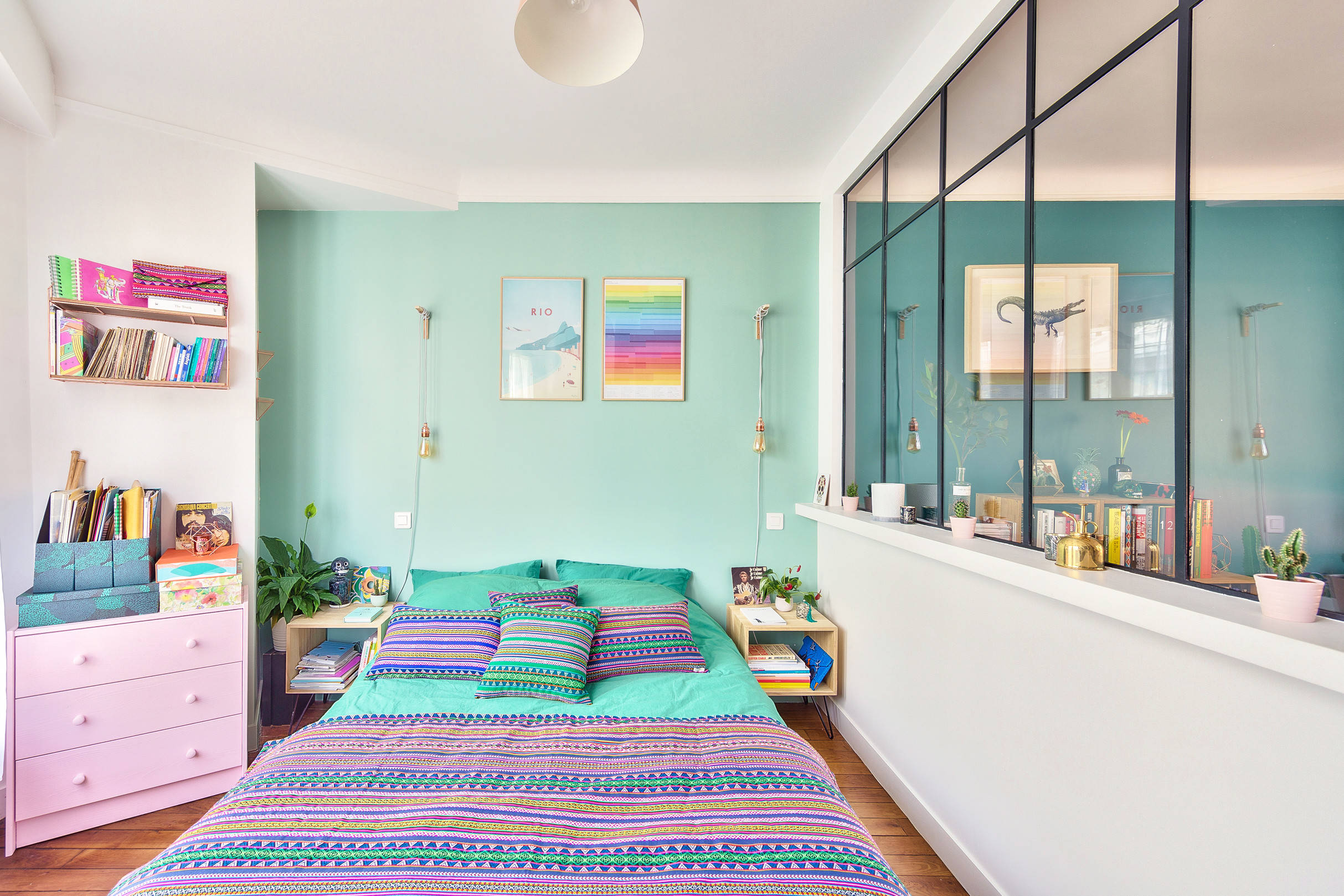 Le soubassement de la verrière permet de dissimuler partiellement le lit de la chambre. Y ajouter une étagère était aussi malin pour permettre d’y poser différents objets. Le salon a certes été agrandi au détriment de l’espace chambre, mais la dimension de cette dernière est tout à fait commode. De plus, elle profite également de la lumière traversante.