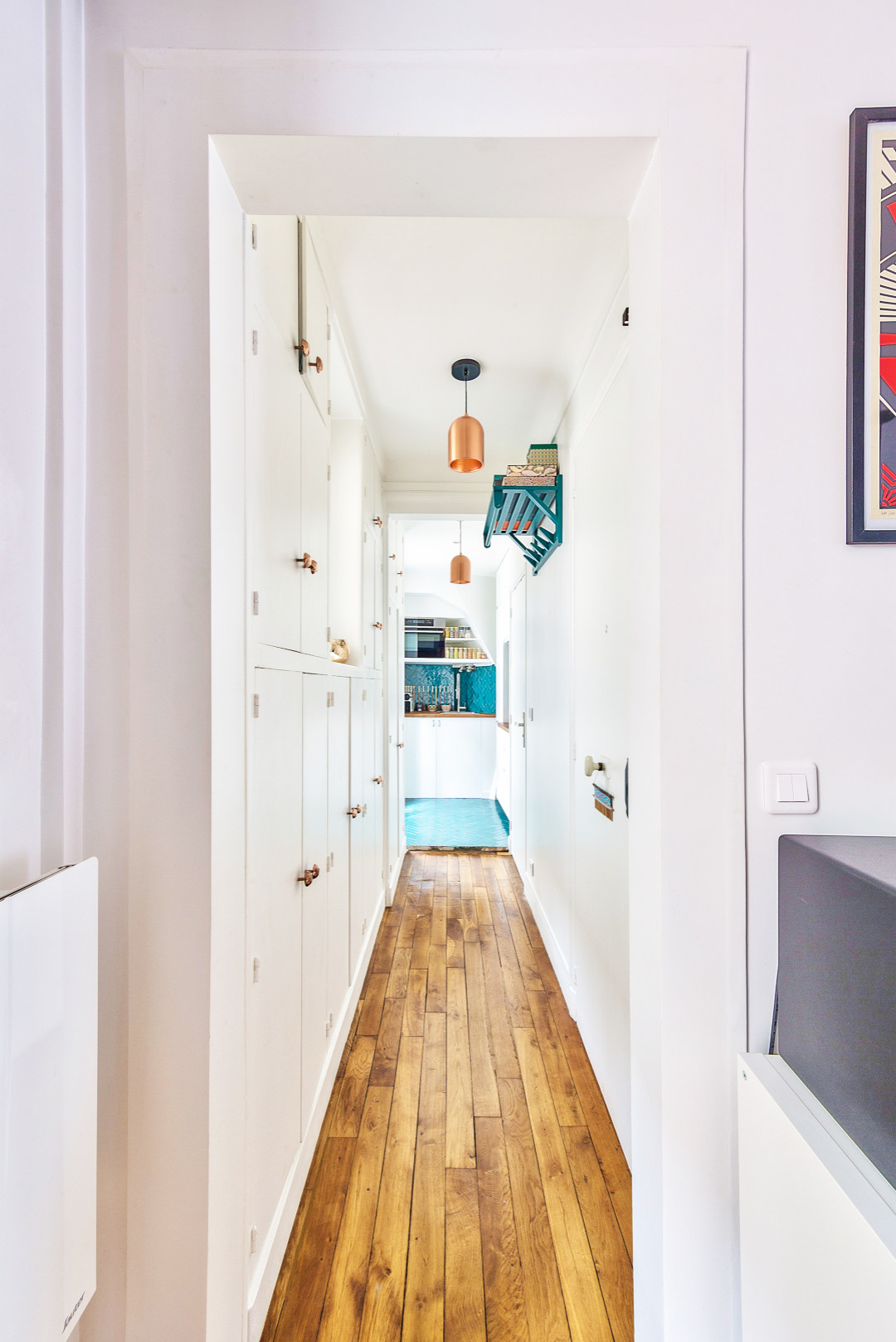 Pour rejoindre la cuisine, il convient d’emprunter ce couloir truffé de rangements profonds d’origine, qui dessert aussi l’entrée et la salle de bains. Margaux a fait la différence en changeant simplement les poignées des portes des placards. Désormais en cuivre martelé, elles apportent une note orientale au projet. Et s’harmonisent avec les nouvelles suspensions en cuivre rose. Quant à l’étagère et portemanteau, elle a été repeinte avec le même vert du salon. Ces « petits riens » ont métamorphosé le couloir !
