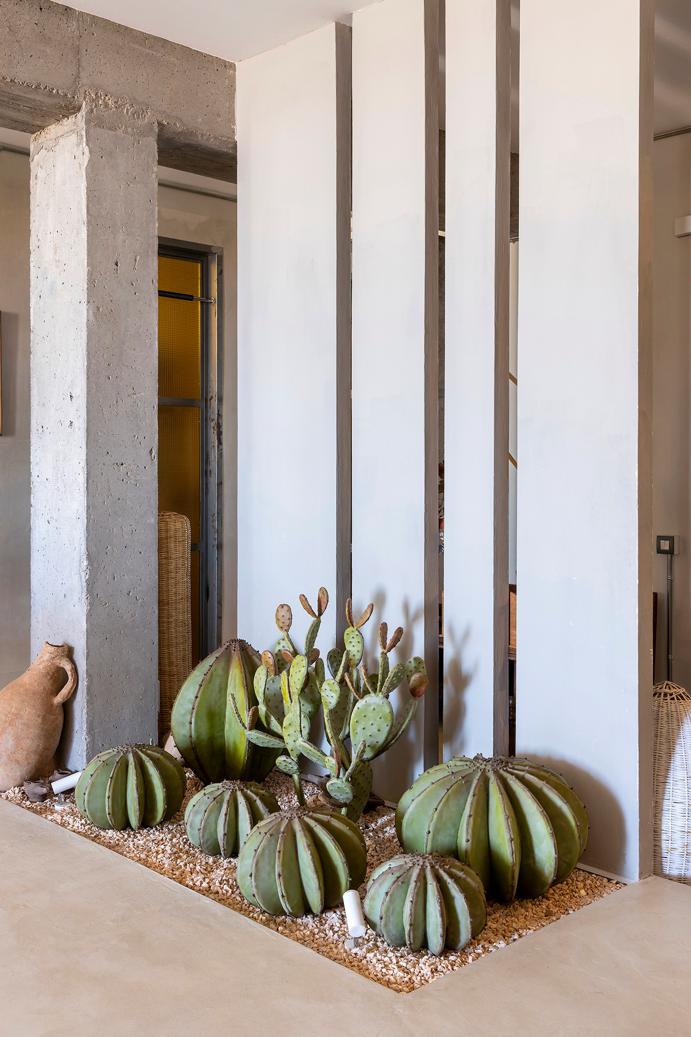 Les sculptures métalliques en forme de cactus, qui rappellent à la propriétaire son pays natal, structurent ce petit coin situé juste derrière l’entrée.