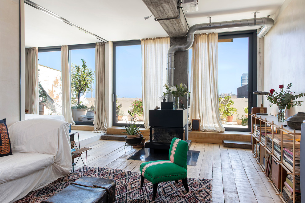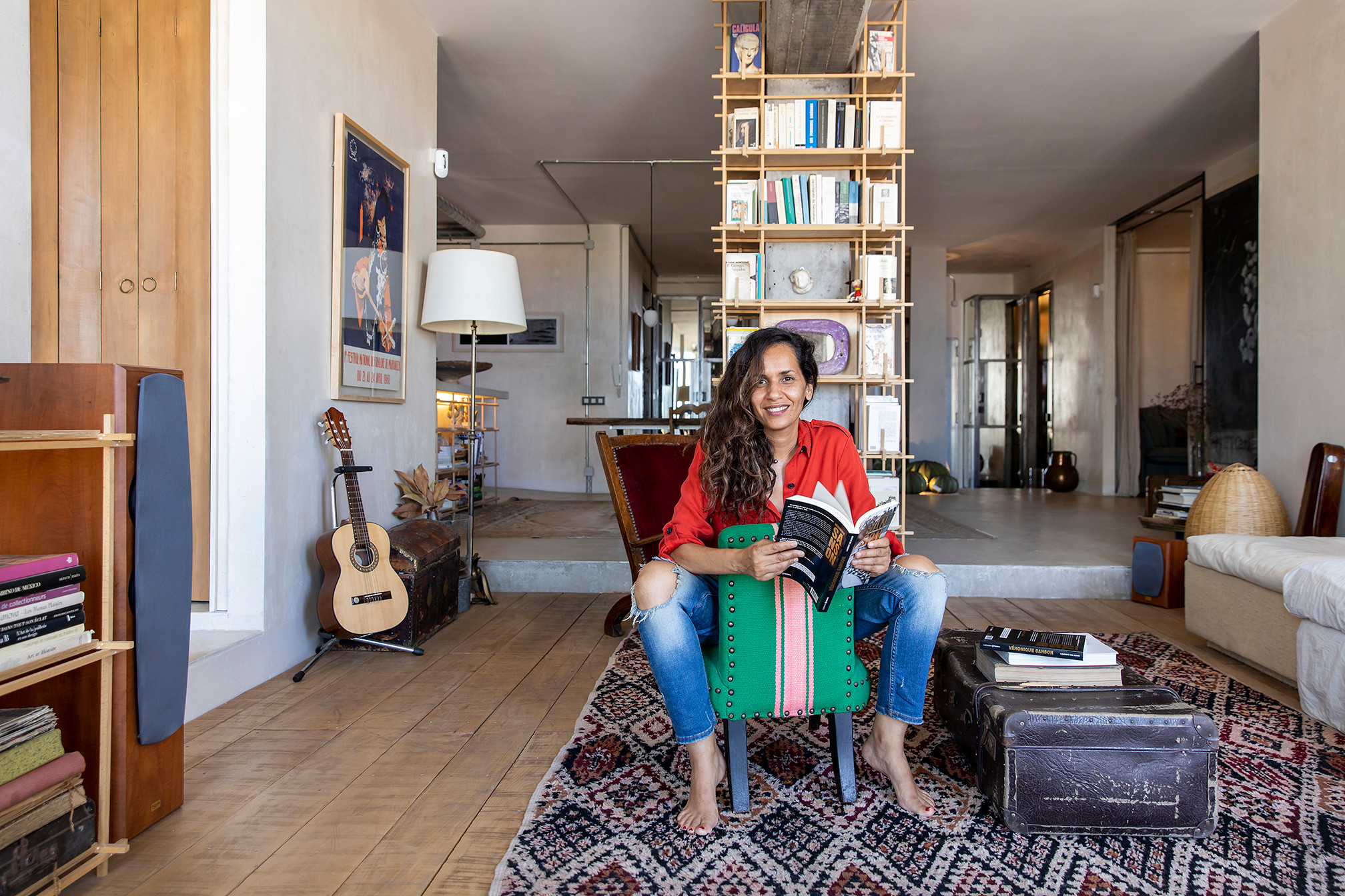 Le bureau/chambre d’amis est situé derrière ces rideaux, comme ont le voit au second plan de cette photo. « Je vis à Barcelone depuis 18 ans, soit depuis que je suis venue dans la ville pour mon projet de fin de diplôme de l’EINA (une université privée, l’École universitaire de design et d’art de Barcelone), et les visites de parents et amis sont très fréquentes », conclut Karima.