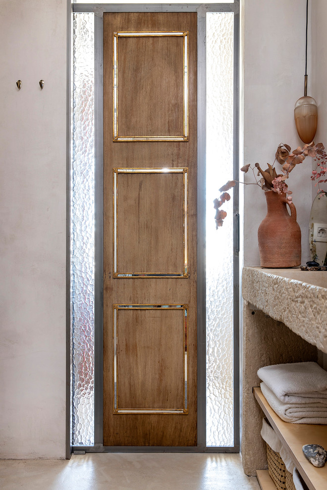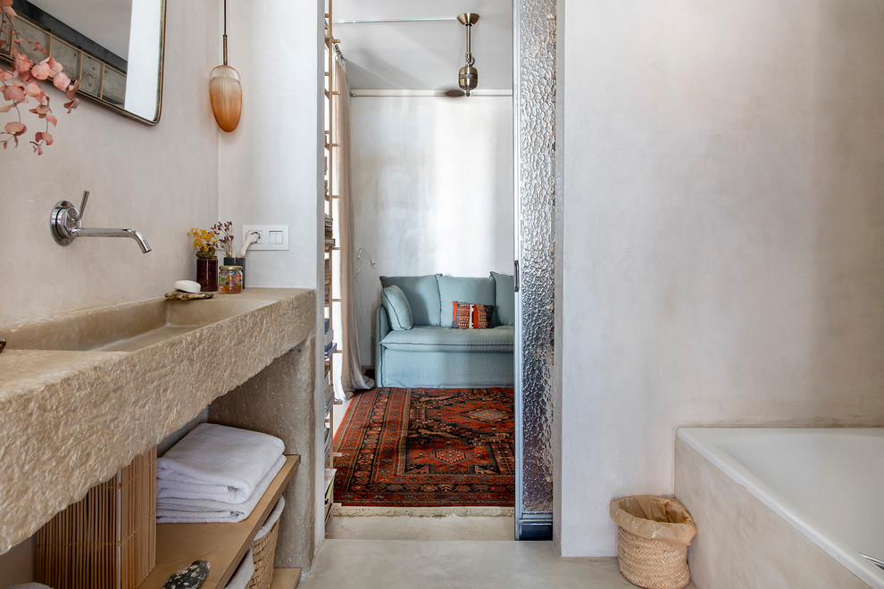 La salle de bains privative est également accessible depuis l’espace bureau/chambre d’amis. À l’intérieur, un lavabo en pierre d’Empordà (en Catalogne, en Espagne) et une grande baignoire sont à l’honneur.