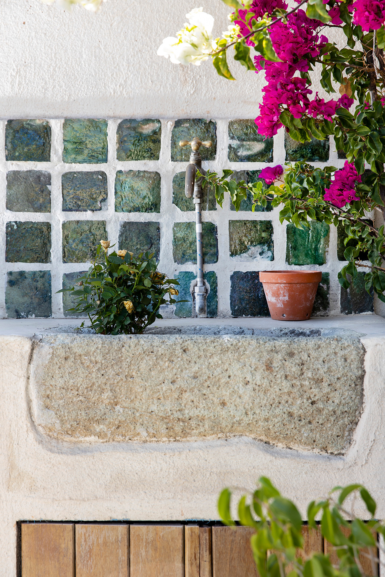 Karima aime l’artisanat. Les carreaux et l’évier que l’on voit sur la photo, par exemple, ont été fabriqués à la main dans une pierre évidée. Les grands pots sur la terrasse sont aussi faits main. « Ils viennent du sud du Maroc et sont très volumineux et lourds », précise Karima.