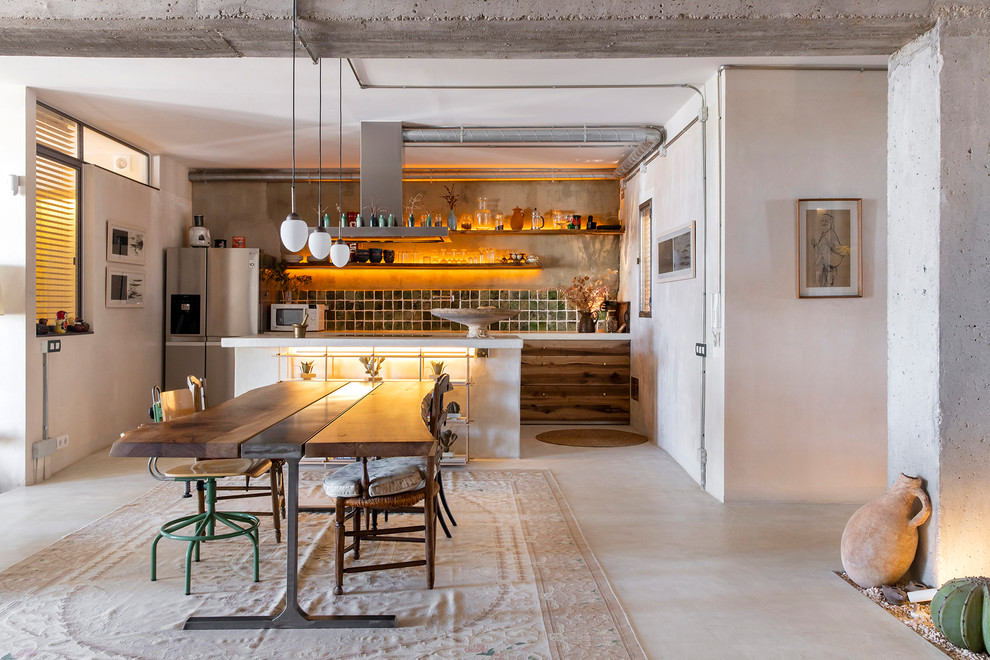 L’îlot de cuisine en béton délimite les espaces entre le coin salle à manger et la cuisine.