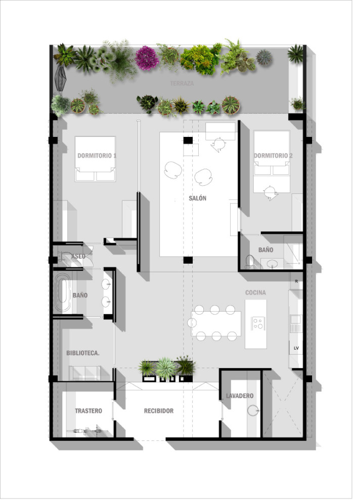 Lorsqu’on entre dans l’appartement, la buanderie est située sur la droite et une pièce de rangement se trouve sur la gauche. Juste en face de l’entrée prend place un grand espace cuisine et salle à manger. Il mène au salon, qui s’ouvre sur la terrasse et s’entoure de deux chambres et deux salles de bains.