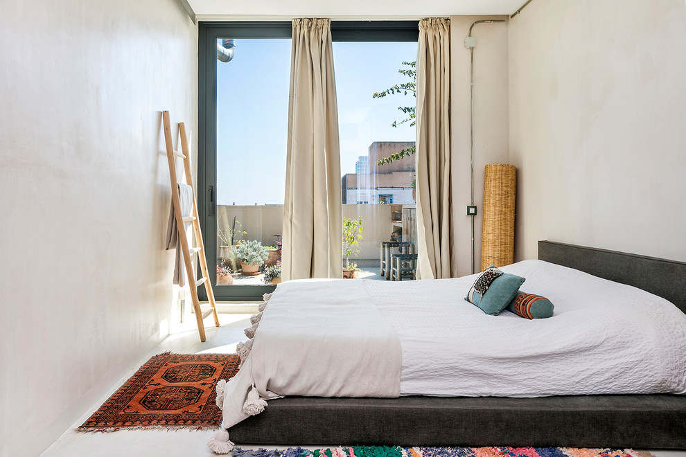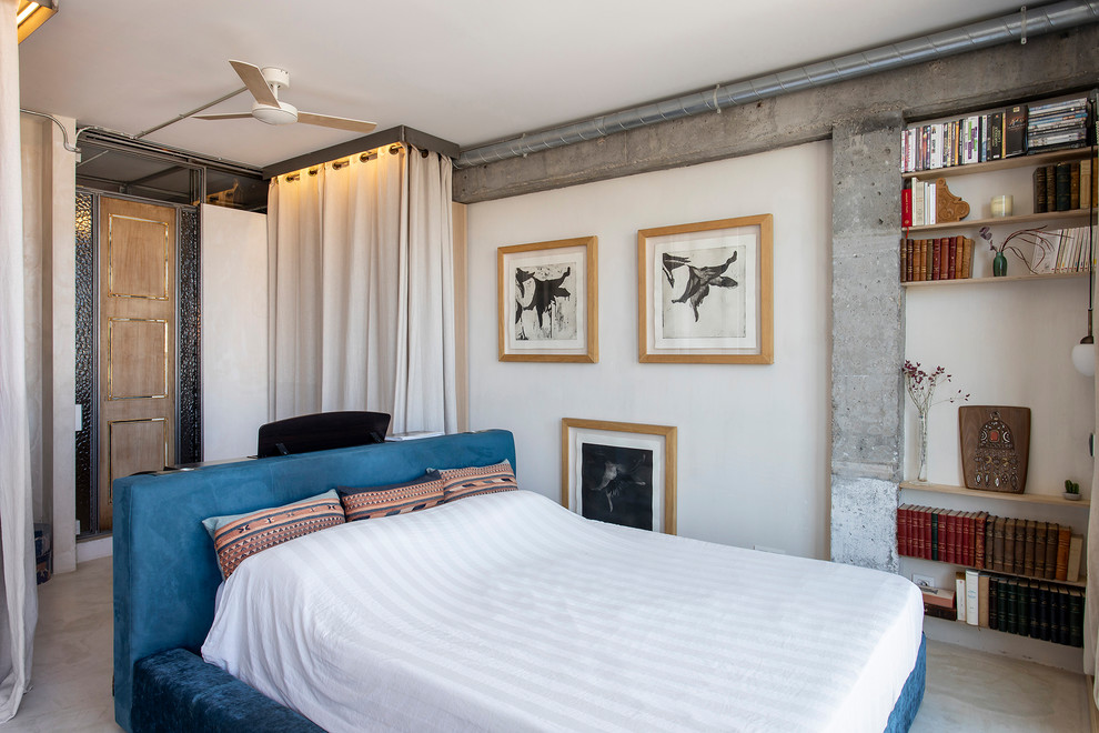 La chambre parentale se distingue par son style industriel. Karima a conçu elle-même le lit doublé de velours. Les lithographies sont signées d’un autre de ses amis, Georg Massanés.
