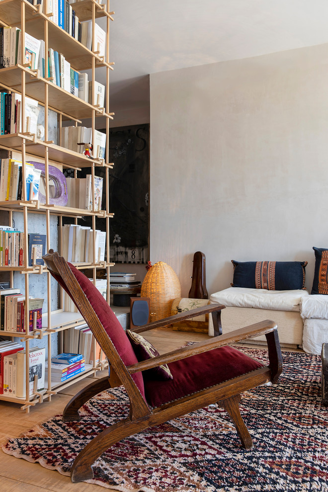 La propriétaire a fabriqué quelques accessoires décoratifs elle-même. Elle a, par exemple, fabriqué les coussins avec des tapis kilim. Les lampes ont aussi été réalisées à la main. Les malles sont un héritage familial, et le tapis vintage vient du Maroc.