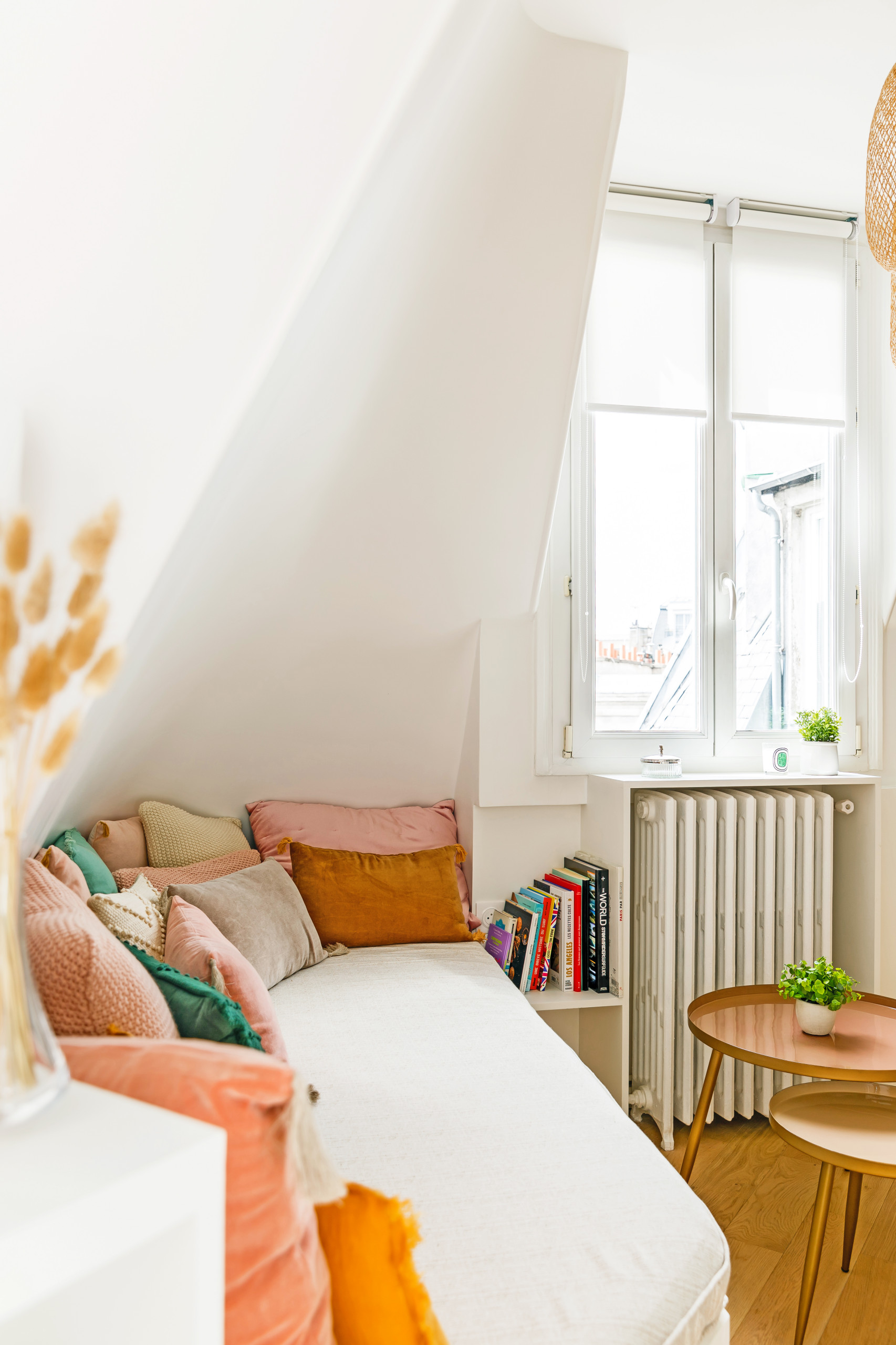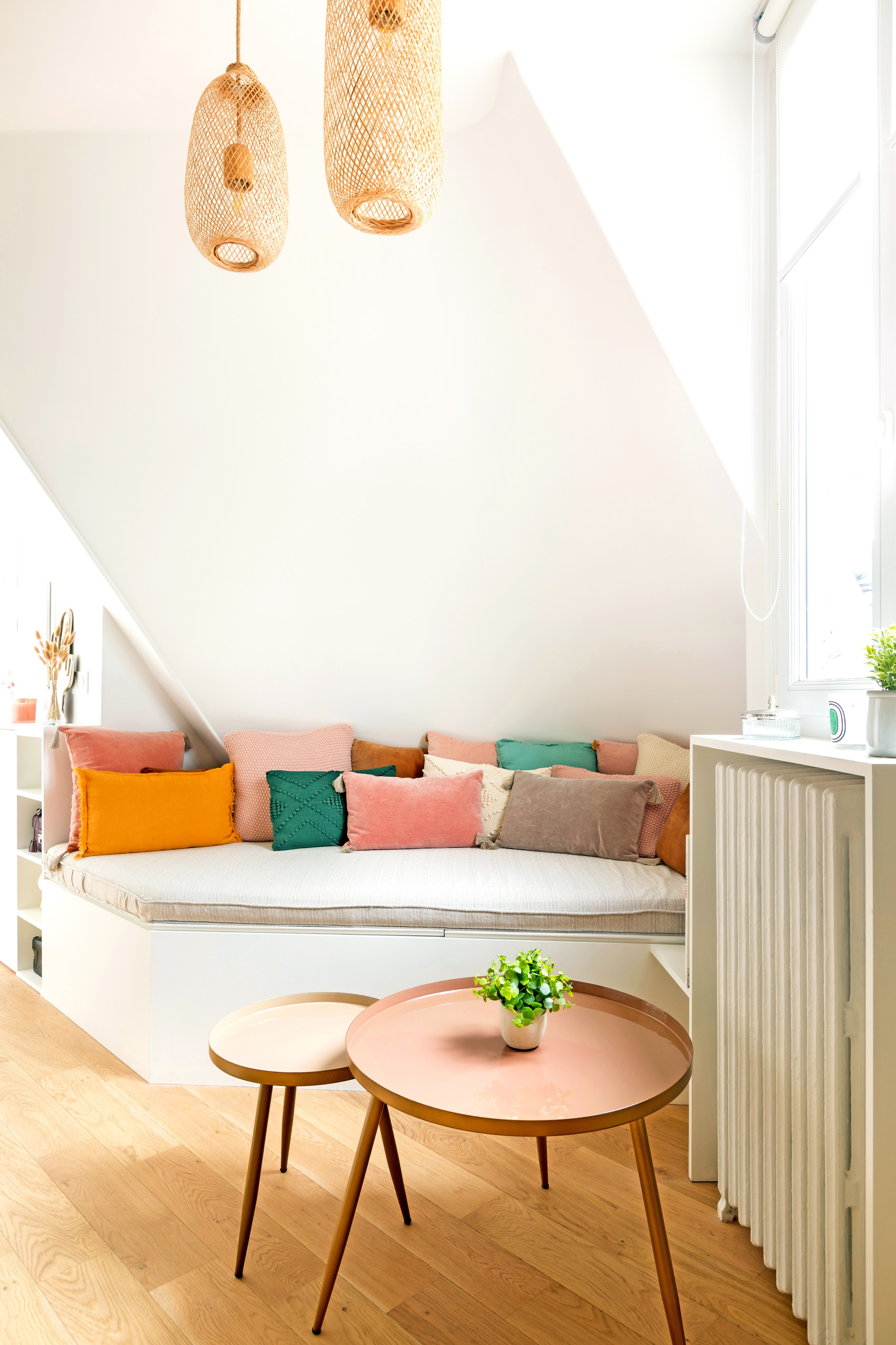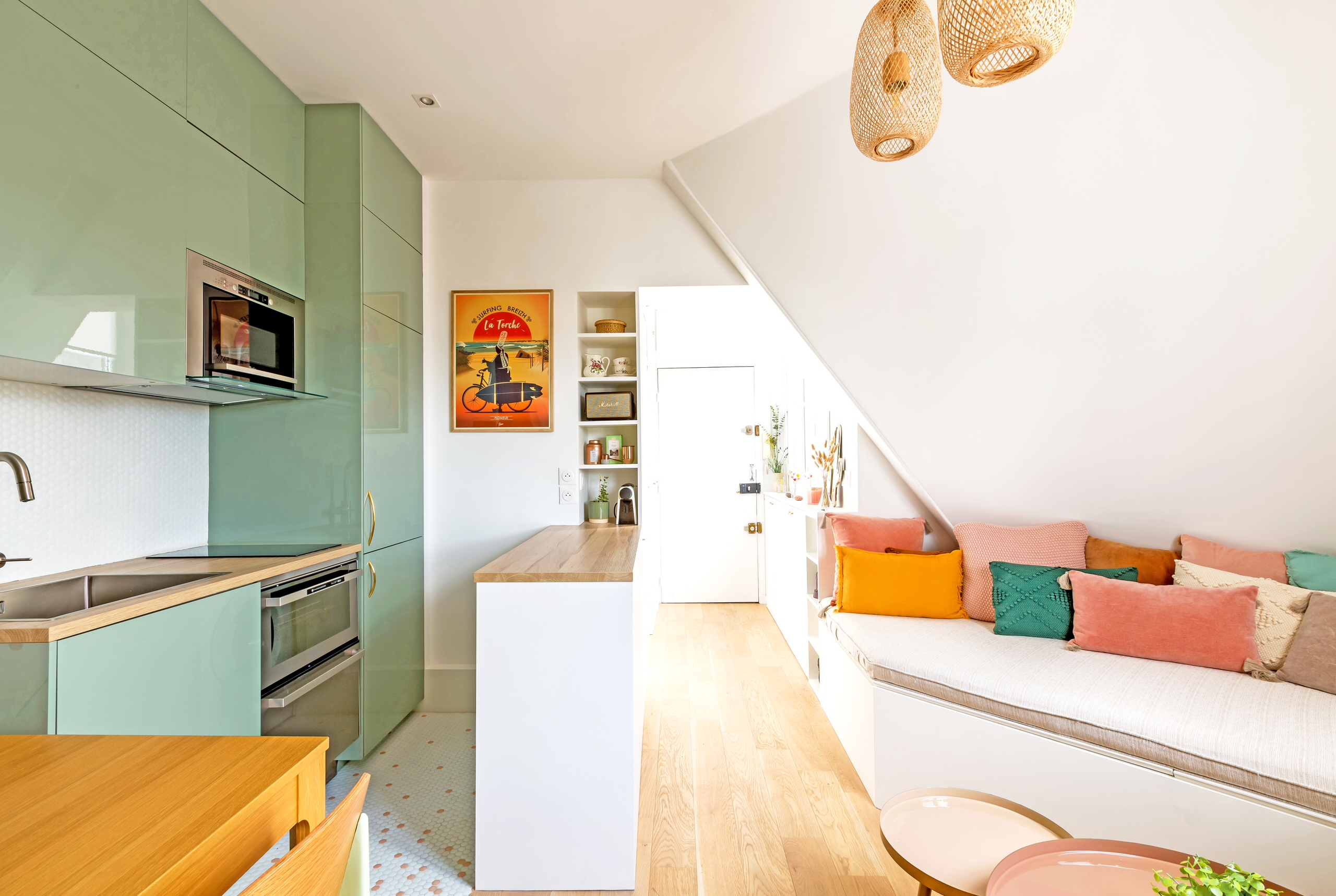 Côté salon, la banquette en lin beige réalisée sur mesure épouse la forme de ce mur biscornu en intégrant une série de rangements supplémentaires. Ce coin cosy accueille une multitude de coussins en velours, lin ou coton aux couleurs vitaminées.