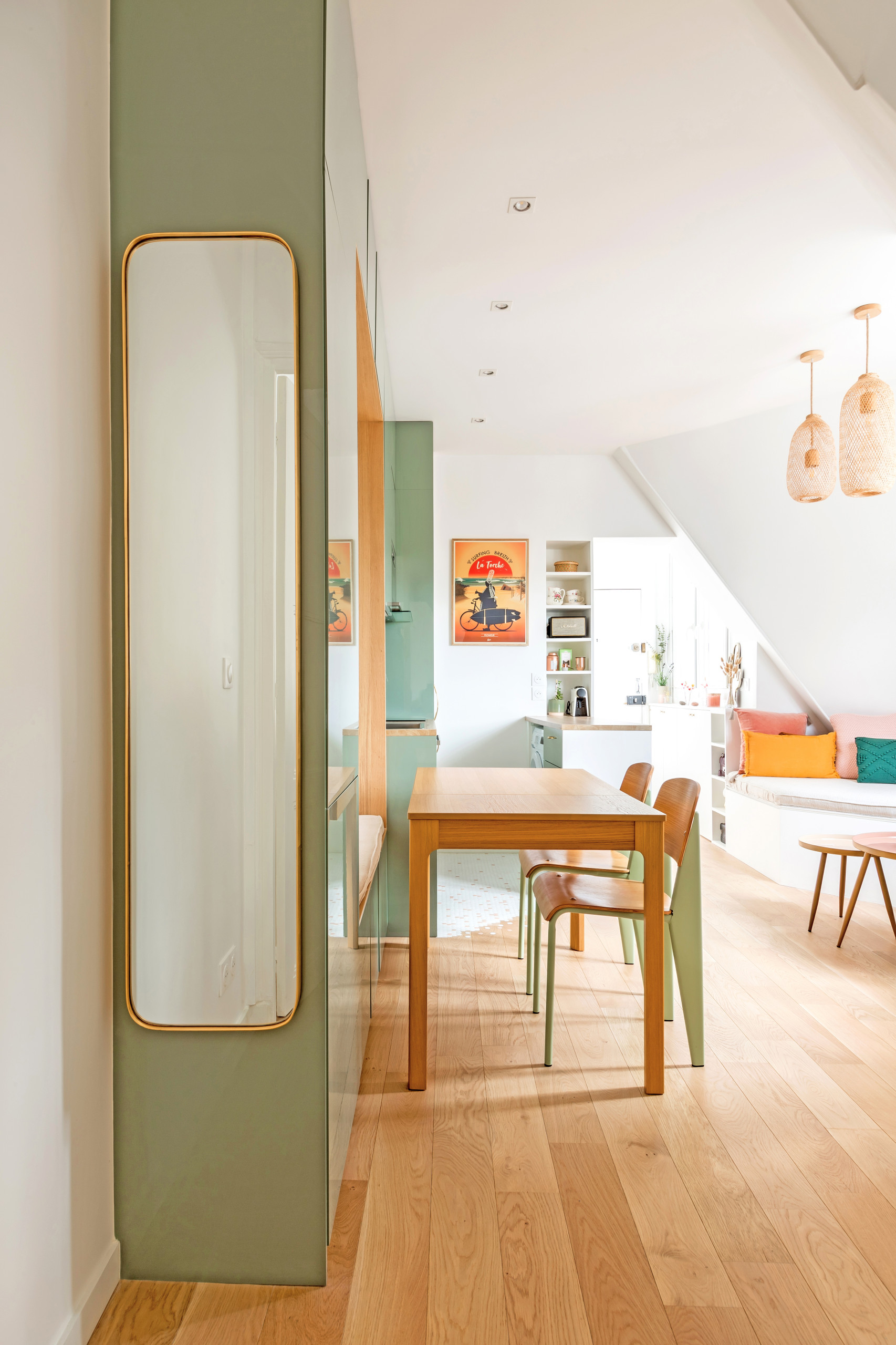 L’espace qui accueille aujourd’hui la salle à manger n’était auparavant pas exploité. « Nous avons créé dans ce coin vide, qui mène à la chambre, un espace dînatoire faisant également office d’espace de travail pour la jeune étudiante », précise Margaux.