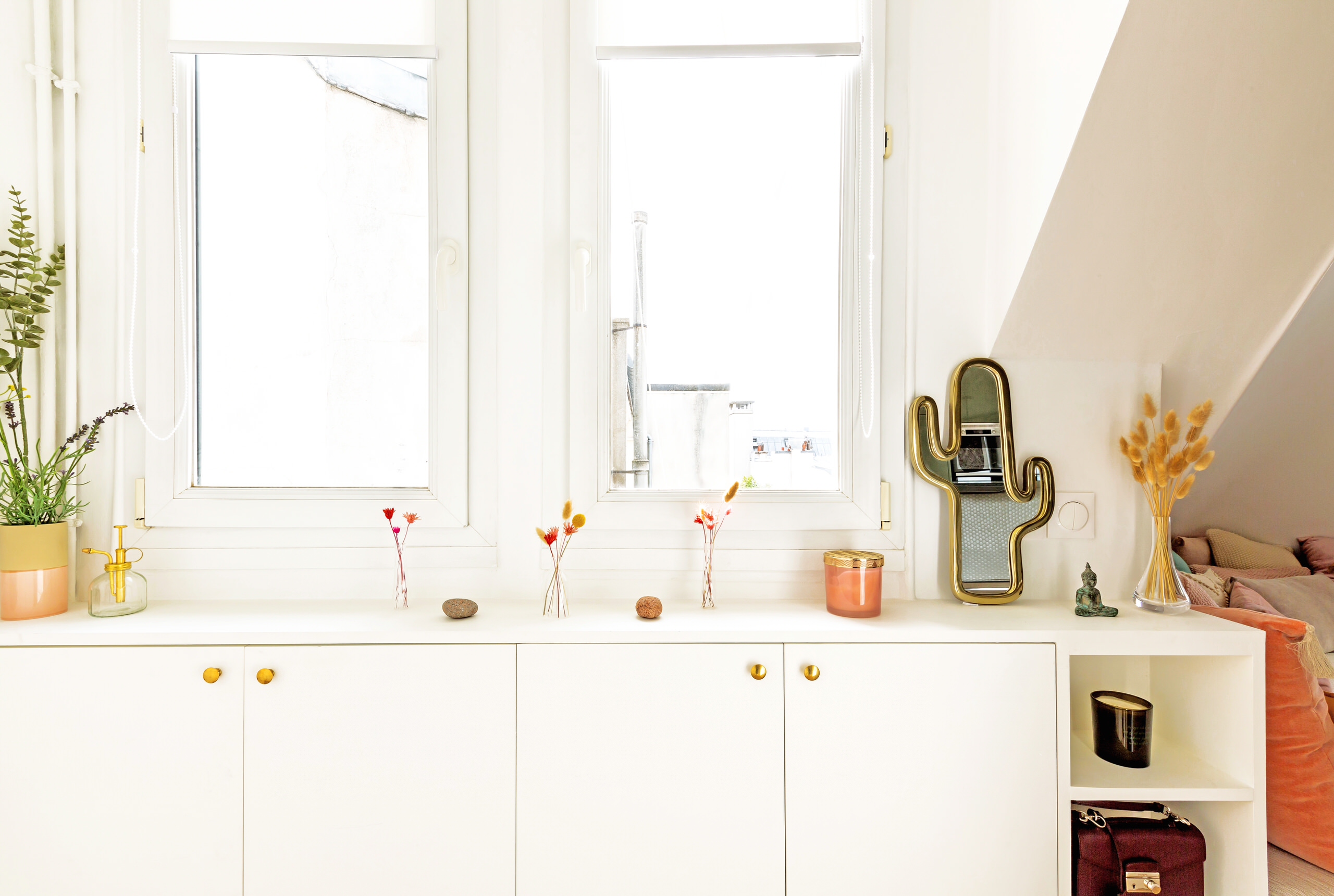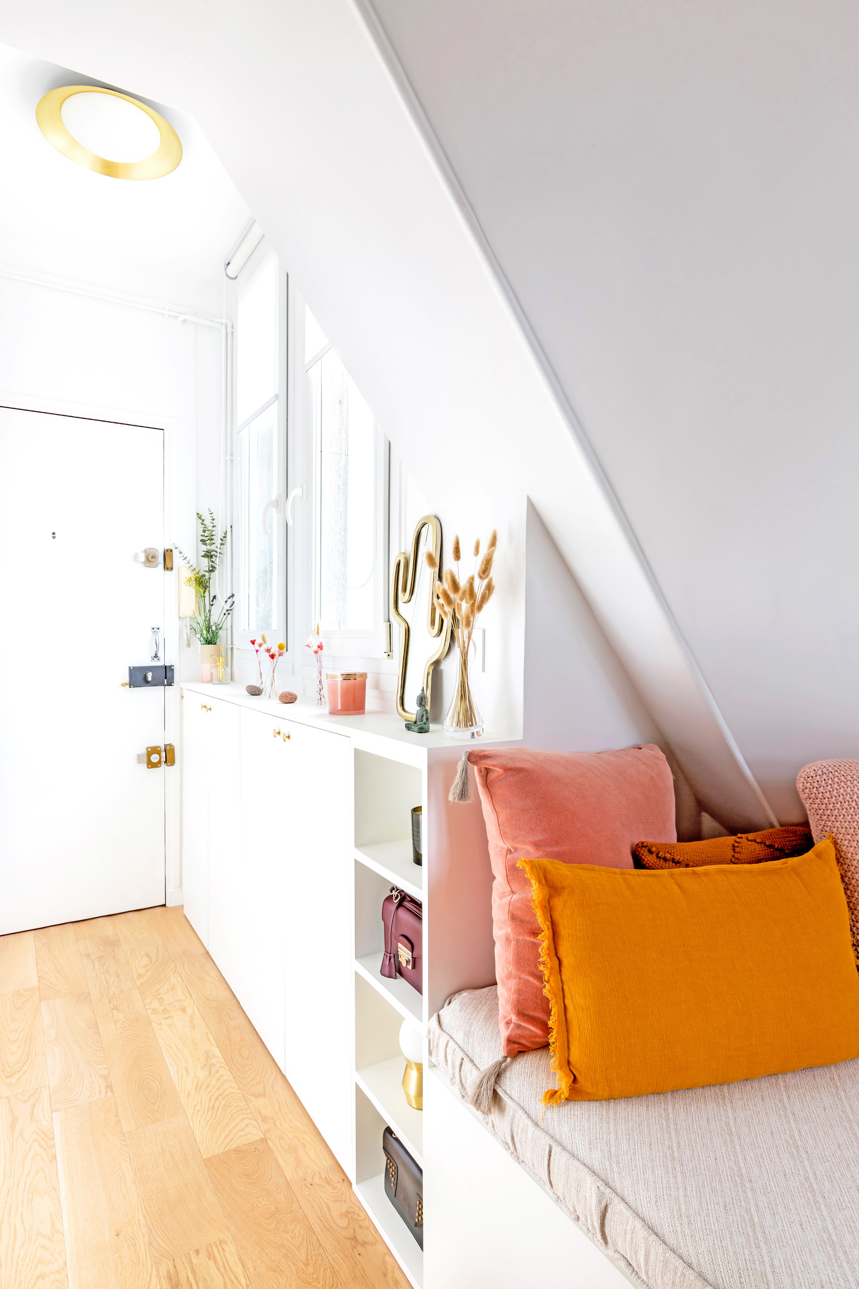 « Nous avons préservé certains placards d’origine et créé de nombreux rangements supplémentaires pour optimiser chaque m² de cet appartement », explique Margaux Carnevali. L’espace entrée, qui n’était auparavant pas exploité, accueille désormais un meuble d’entrée réalisé sur mesure en médium peint côté fenêtre. Celui-ci permet également d’animer cette zone avec quelques bouquets et objets de décoration.