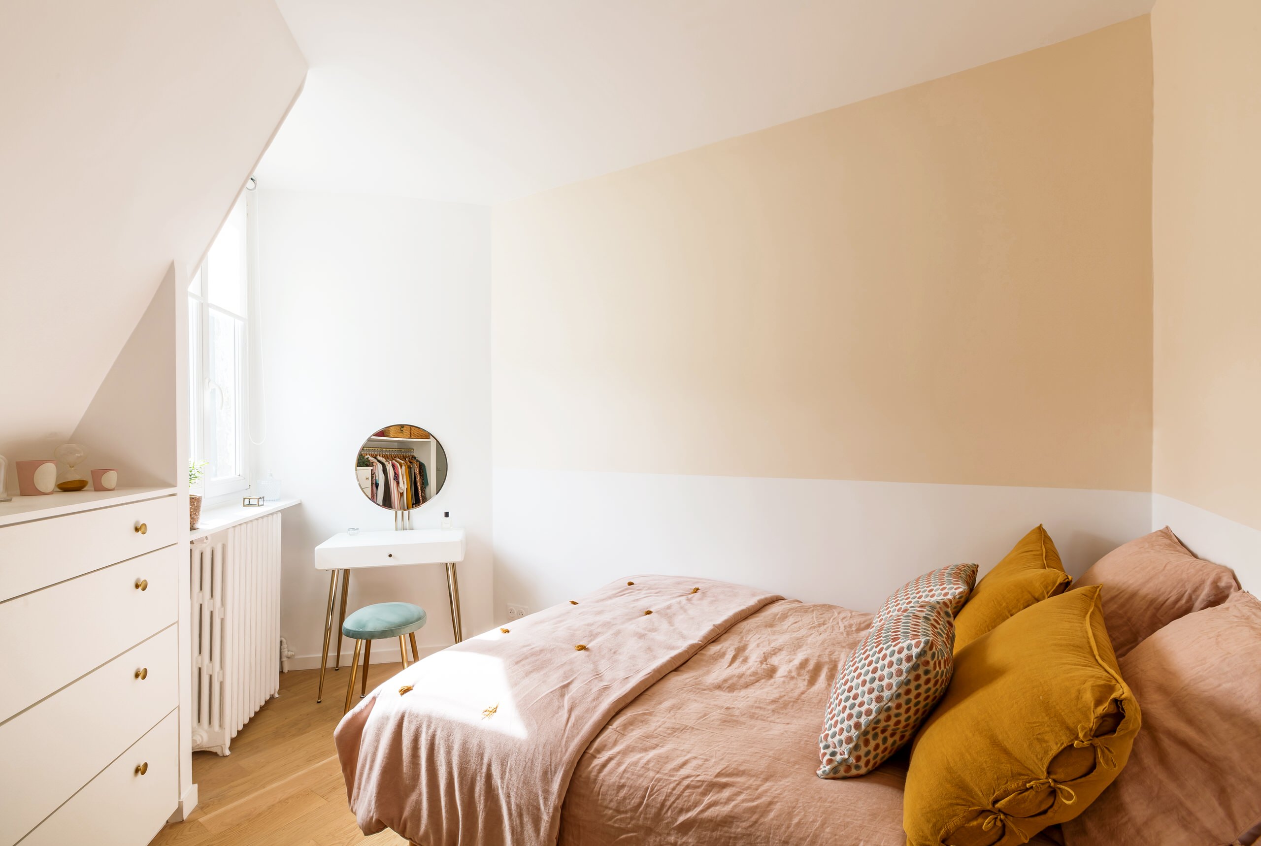 La fenêtre, située à proximité, crée des effets d’ombre et de lumière sur les portions de murs habillées d’une douce teinte beige. « J’ai volontairement laissé la partie basse en blanc et privilégié une mise en couleur de la partie haute afin de mettre en valeur le linge de lit en lin rose pâle et ocre, qui contraste ainsi avec la tête de lit blanche », nous livre l’architecte d’intérieur.