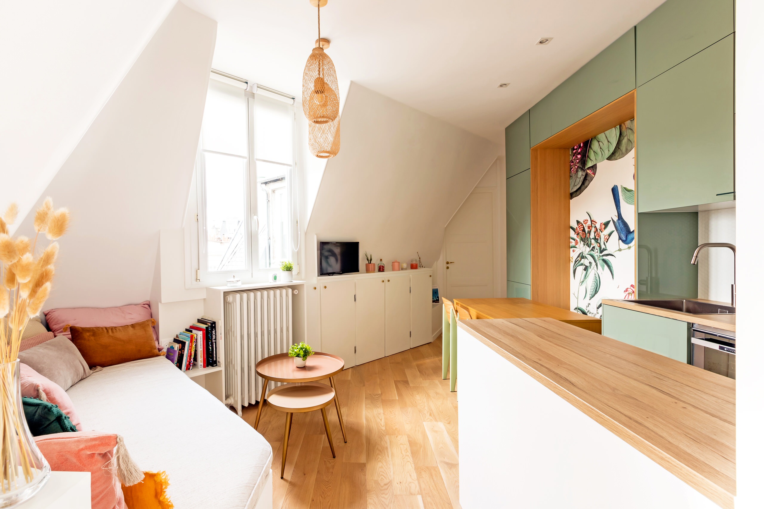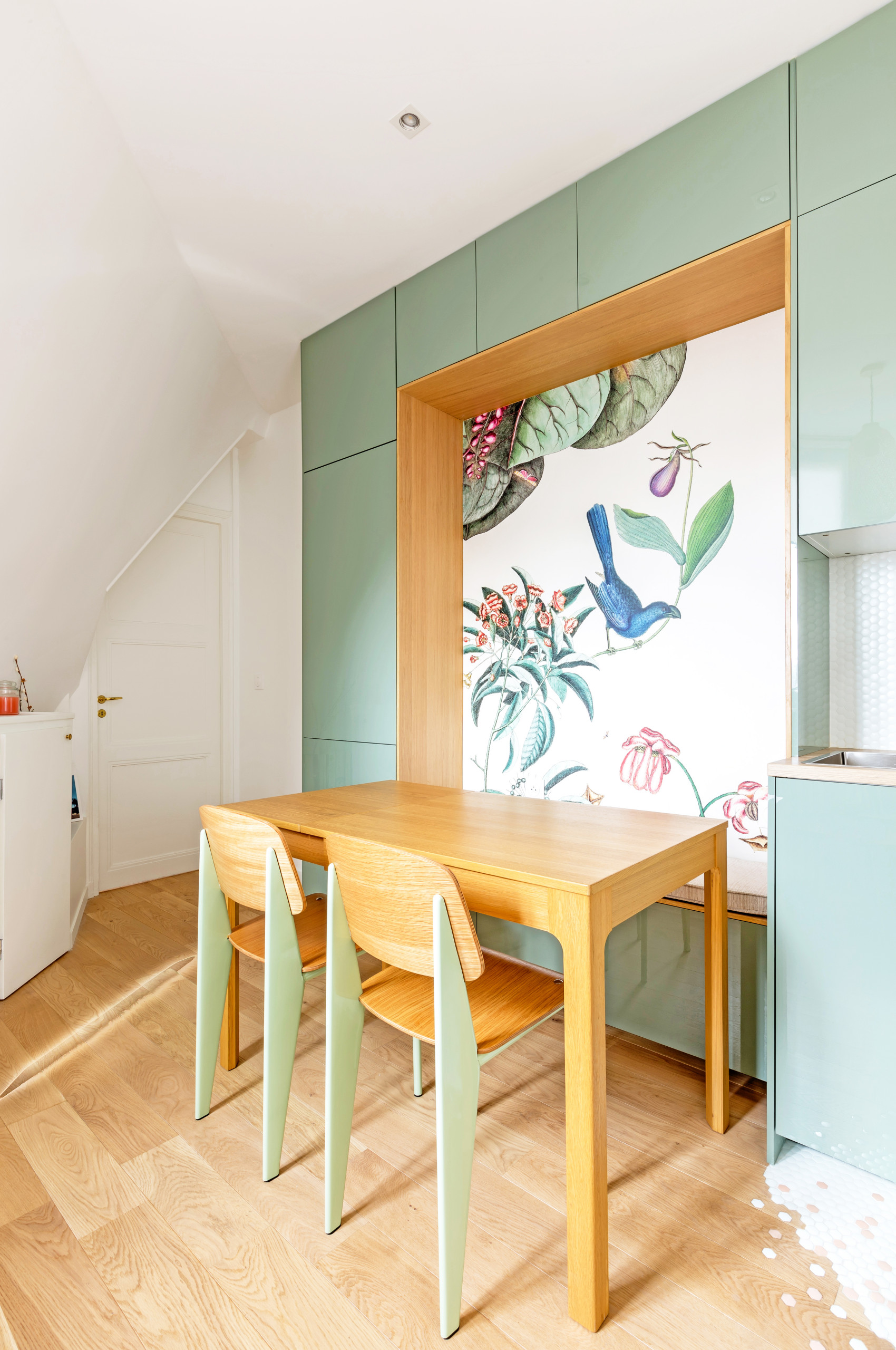 La cuisine adopte un ton vert amande printanier, frais et léger, qui s’associe à un papier peint au motif végétal. « J’ai opté pour ce papier peint poétique qui réfléchit la lumière et entame un dialogue avec la fenêtre en face », nous livre l’architecte d’intérieur. Ce cadre en plaqué chêne accueille également une banquette avec rangements intégrés.