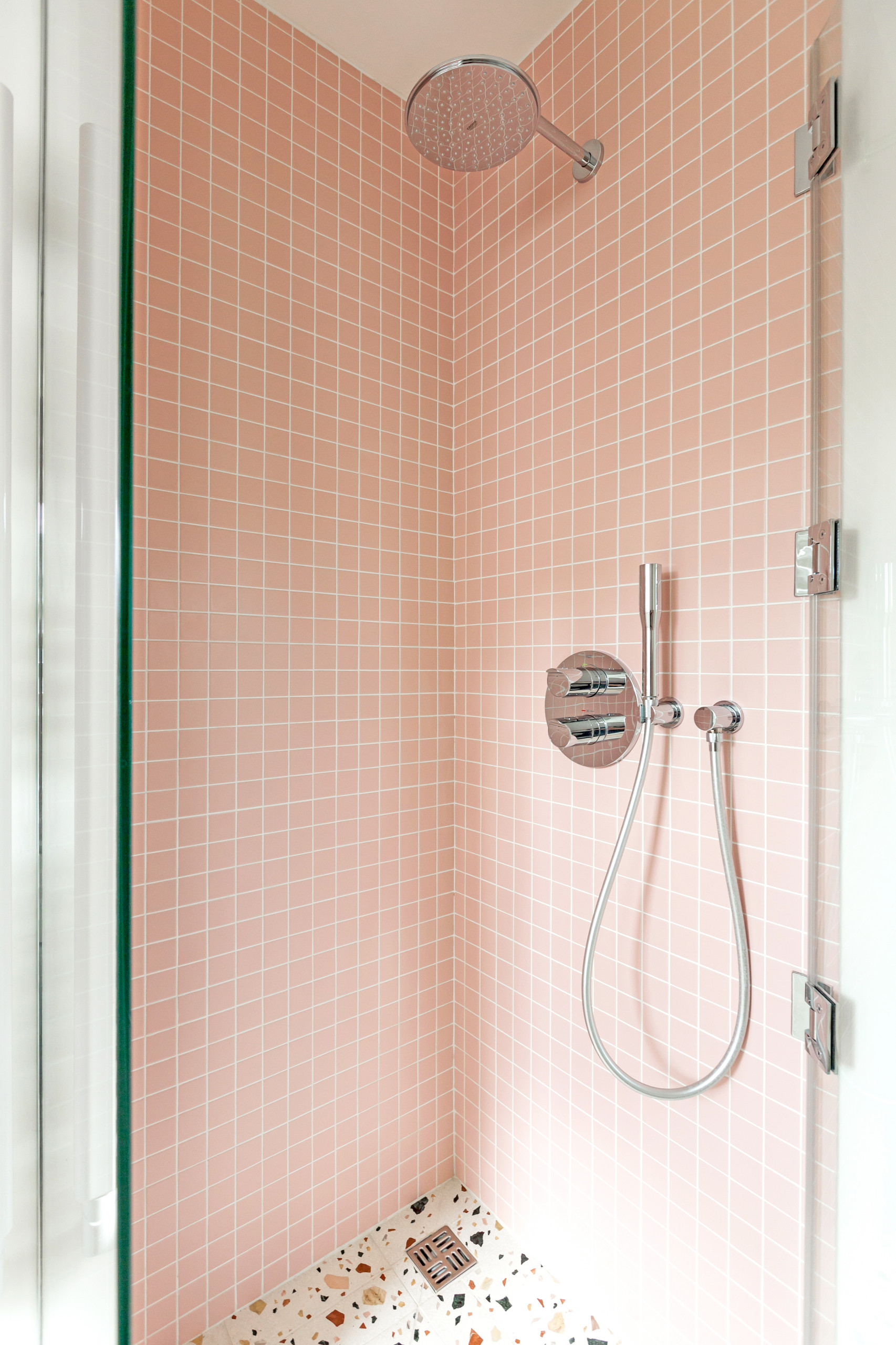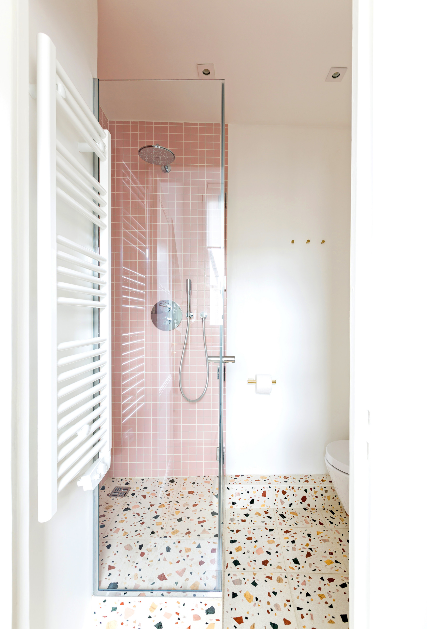 Changement de décor avec cette nouvelle salle de bains rose qui mixe un carrelage aux tons roses à un terrazzo multicolore. « Dans cette salle de bains d’une superficie de 3 m², nous avons réussi à tout intégrer. Pour ne pas avoir à installer un receveur de douche blanc, nous avons créé une petite marche permettant d’avoir une continuité au niveau du sol », précise l’architecte d’intérieur.