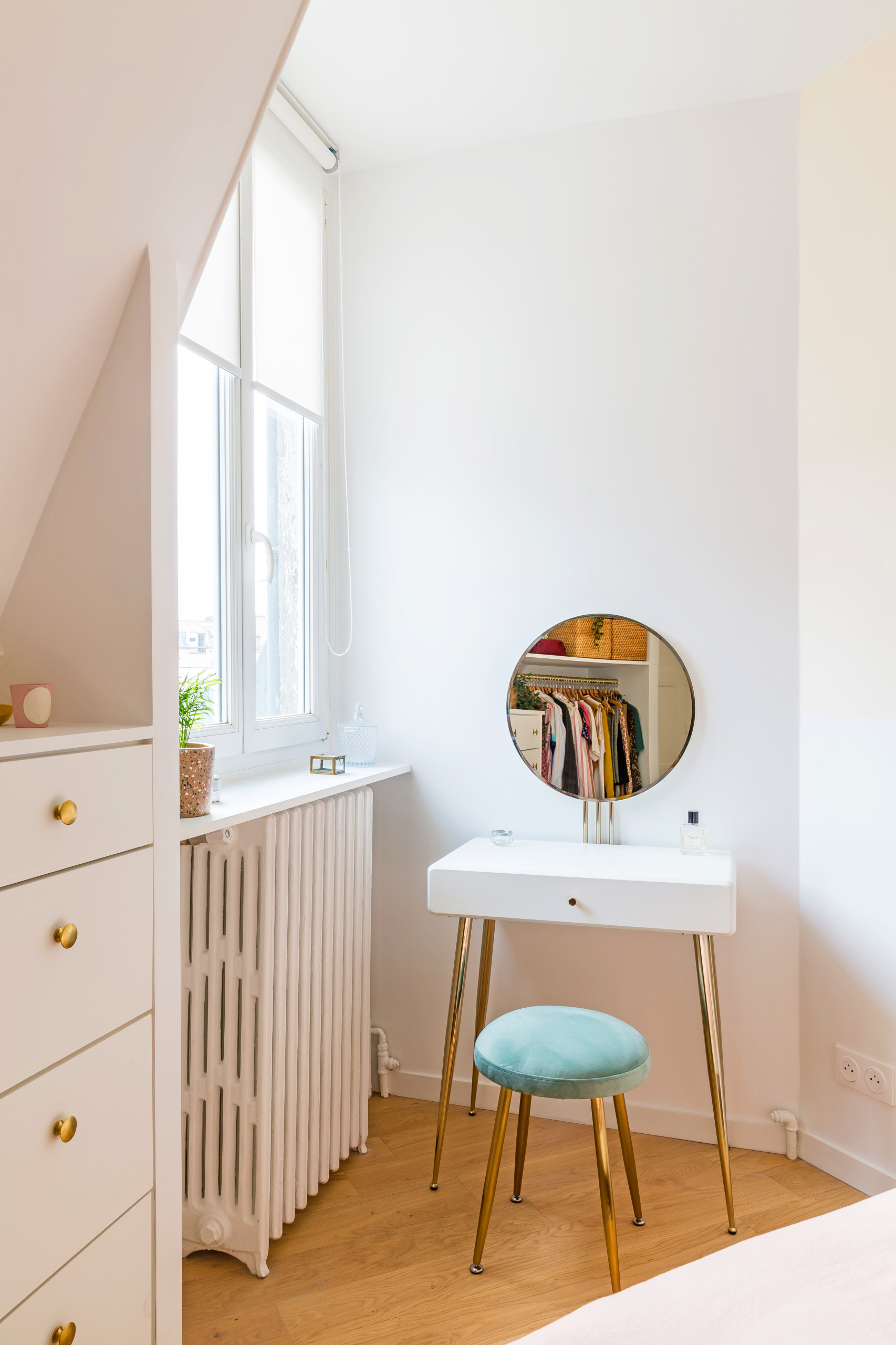 Cette jolie coiffeuse compacte a trouvé son emplacement idéal près de la fenêtre.