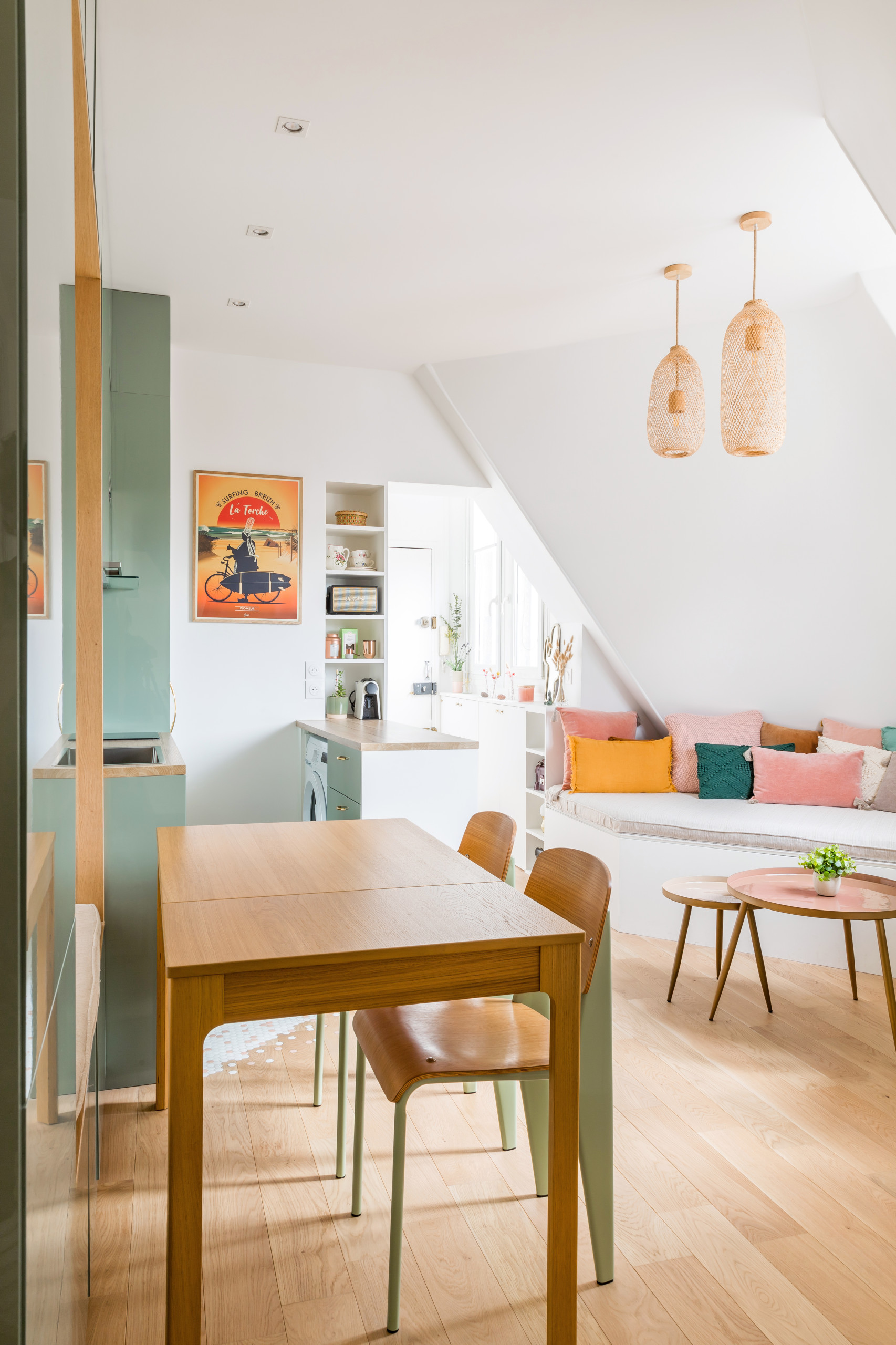 Les propriétaires des lieux, qui ont acheté cet appartement de 30 m² pour leur fille étudiante, ont fait appel à Margaux Carnevali, fondatrice de l’agence Neva Architecture Intérieure, pour son expérience dans la rénovation de petites surfaces. « Cet appartement du Xe arrondissement parisien avait été rénové pour la mise en vente. Celui-ci était habitable en l’état mais très mal agencé. Il y avait beaucoup de place perdue et le lieu était très sombre. Il était impératif d’optimiser cet espace afin de révéler tout son potentiel », nous livre Margaux Carnevali. Le challenge ? Optimiser les volumes de ce nid douillet, perché au sixième et dernier étage, en créant plusieurs espaces en un. Dans ce 30 m² ont ainsi été créés un coin salon, un espace cuisine agrémenté d’une salle à manger mais aussi une chambre indépendante disposant d’un dressing.