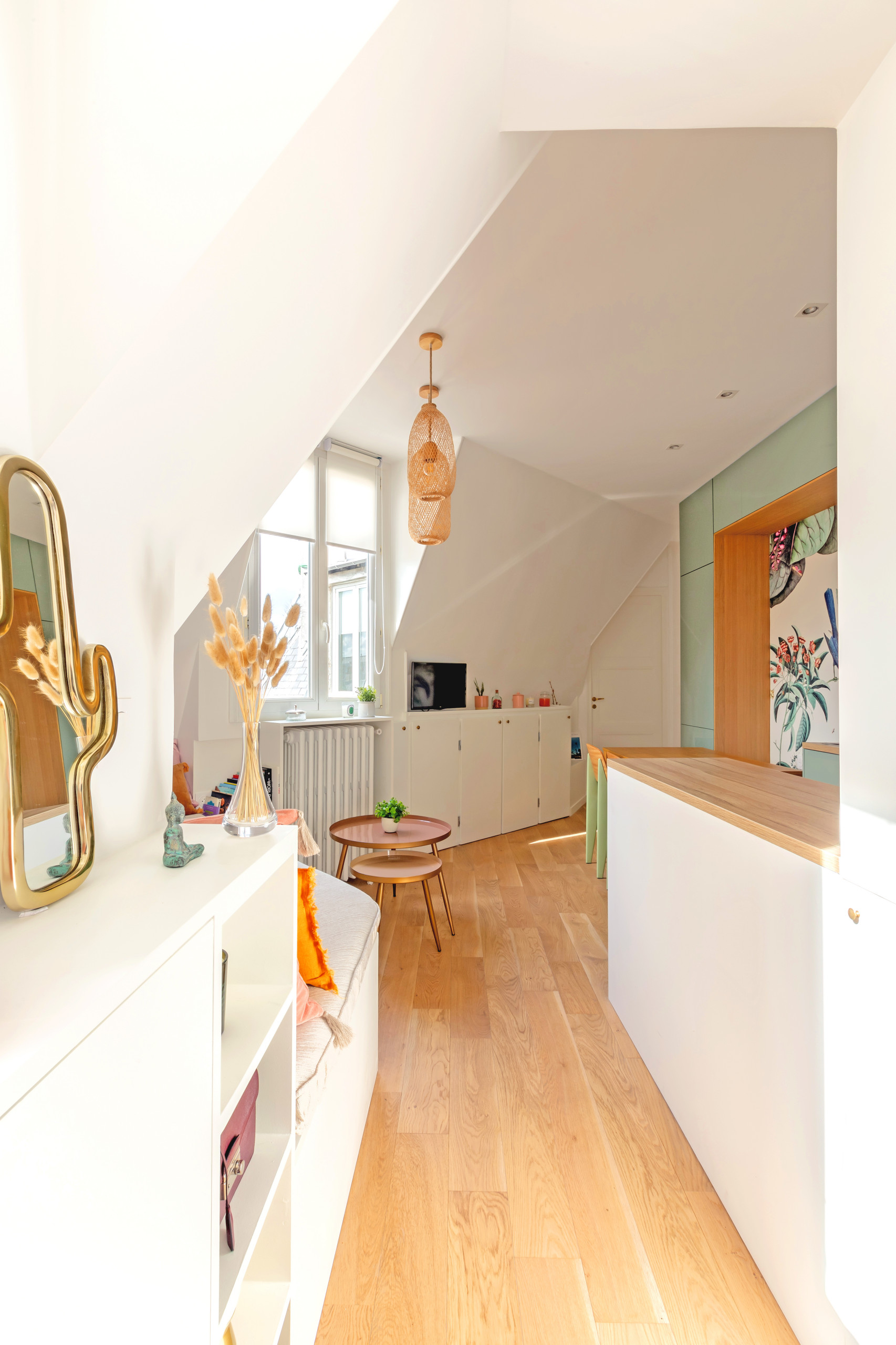 « Pour plus de praticité et de confort, nous avons inversé les aménagements en plaçant le lit au niveau de la plus grande hauteur sous plafond », précise Margaux.