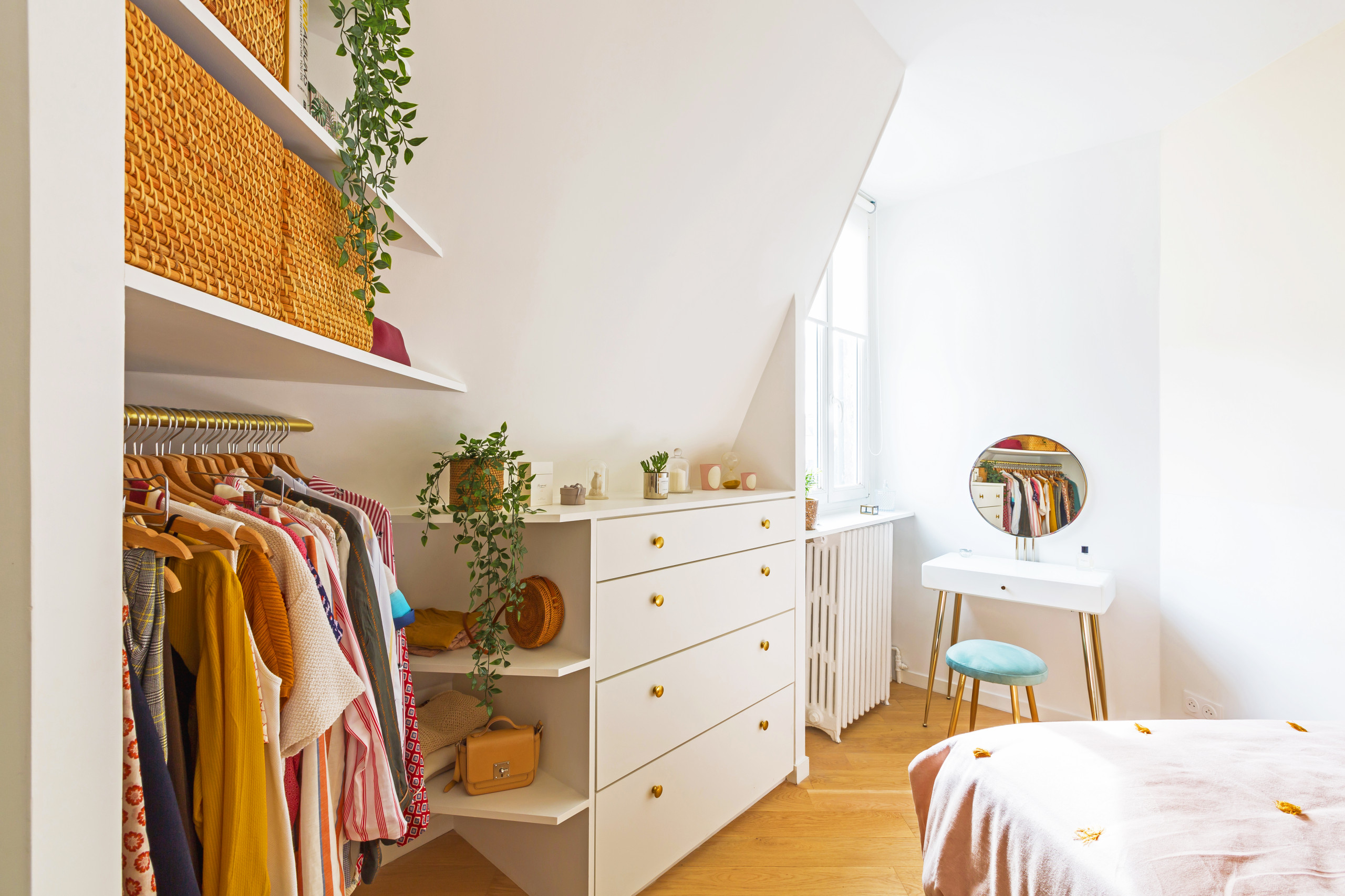 Deux portions de cloisons ont été créées afin d’intégrer un dressing ouvert et une série d’étagères pour entreposer vêtements, plantes vertes et livres.