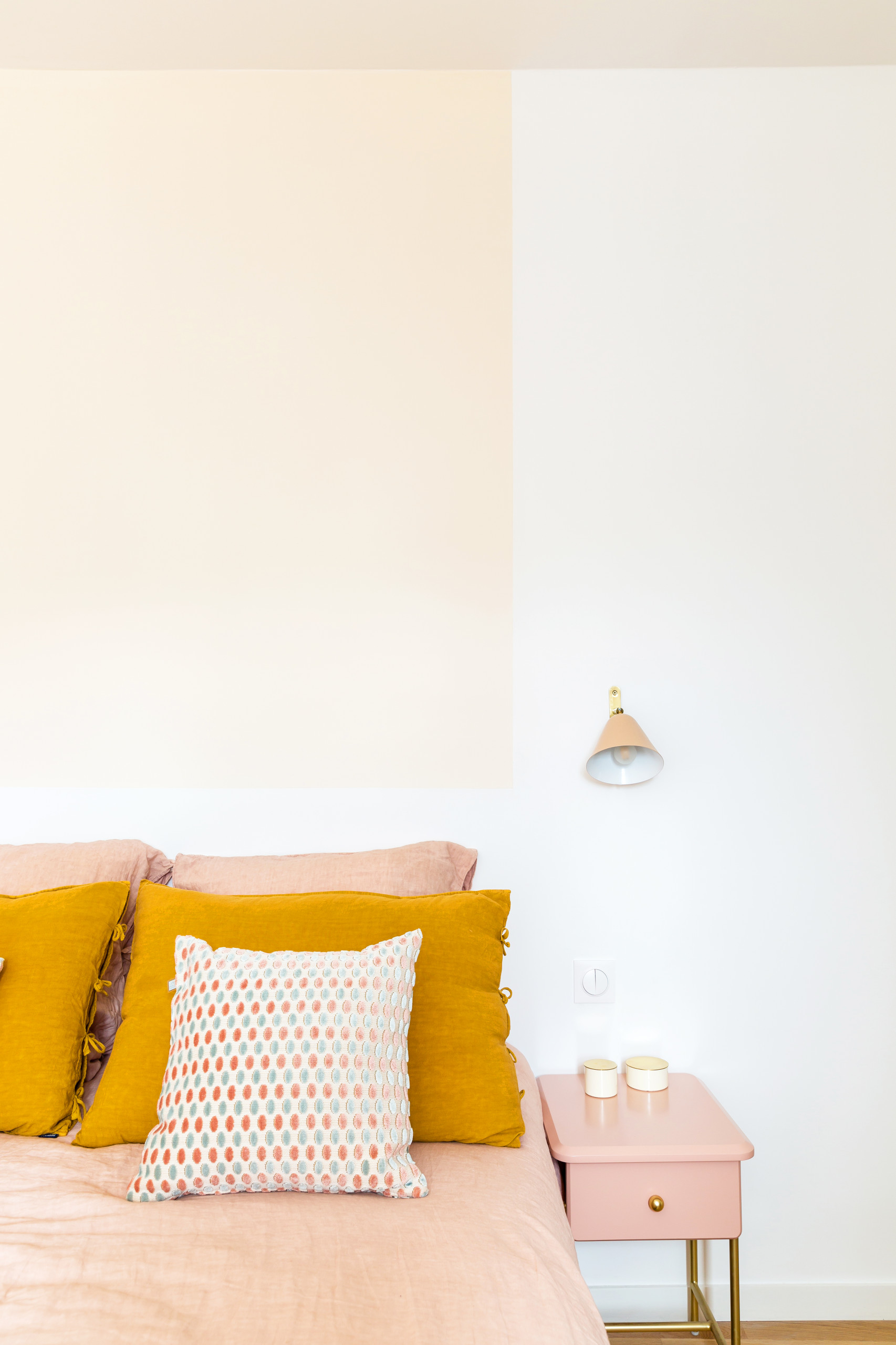 Une petite applique en métal rose poudré et une table de chevet avec son piétement en laiton ajoutent une note chic et douce à cet espace.