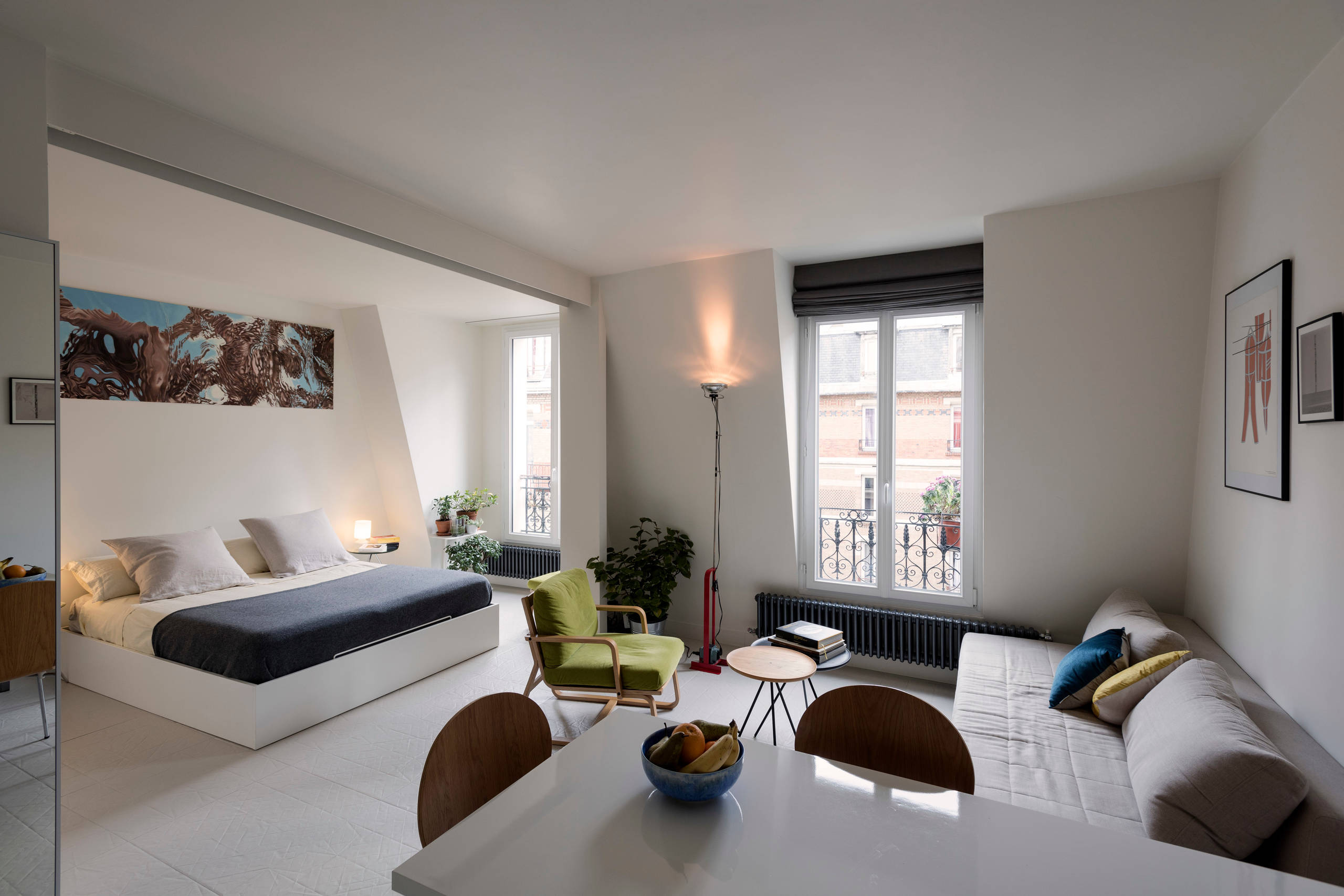 Dans cet open space, un grand panneau coulissant permet d’isoler la chambre de la pièce à vivre ou, au contraire, d’ouvrir complètement pour créer un espace unique. Les portes coulissantes suspendues créent une continuité entre les deux zones.