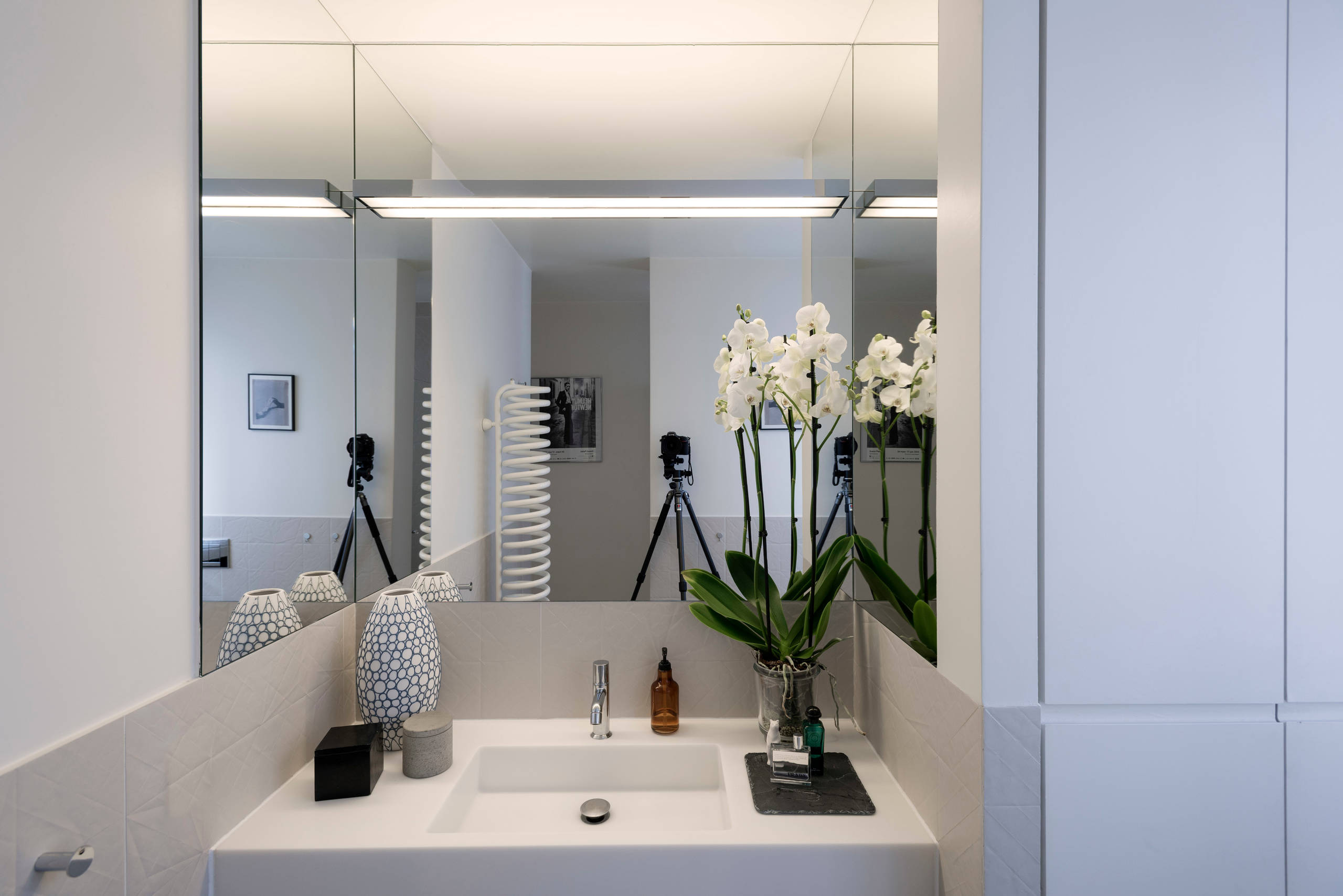 Cet espace, qui adopte les mêmes codes que la pièce à vivre, accueille un grand lavabo réalisé sur mesure en Corian. Élément fort de cette pièce, le sèche-serviettes, que l’on aperçoit dans le miroir, adopte une forme hors du commun, telle une œuvre sculpturale. À droite, un placard technique accueille discrètement la chaudière et le lave-linge.
