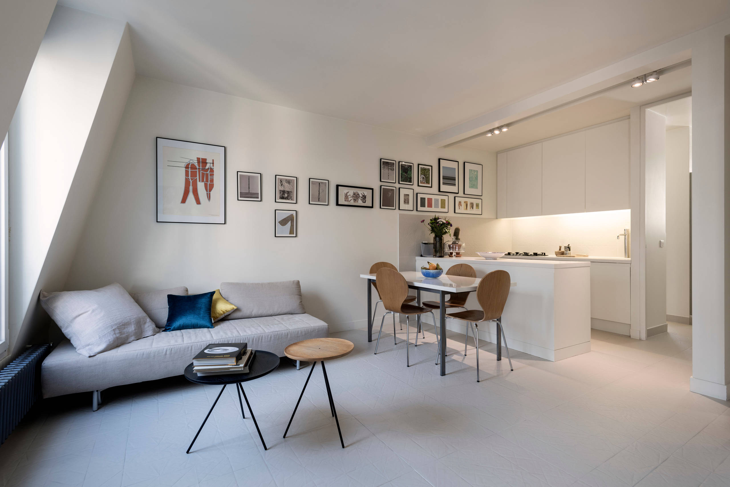 Cet appartement de 40 m² situé dans le XIXe arrondissement parisien s’est métamorphosé en un pied-à-terre moderne, lumineux et facile à vivre. Le propriétaire des lieux a fait appel à l’architecte Fabrizio Fiorentino pour orchestrer ce projet de rénovation totale. Le deux-pièces autrefois vétuste a ainsi laissé place à un loft contemporain où le blanc règne en maître. « Cet espace niché dans un immeuble en briques datant des années 30 ne disposait pas de mur porteur. Nous avons pu déposer l’intégralité des cloisons, l’objectif étant de supprimer les anciennes pièces étriquées pour créer un espace ouvert et fluide, qui soit le plus fonctionnel possible », nous livre l’architecte.