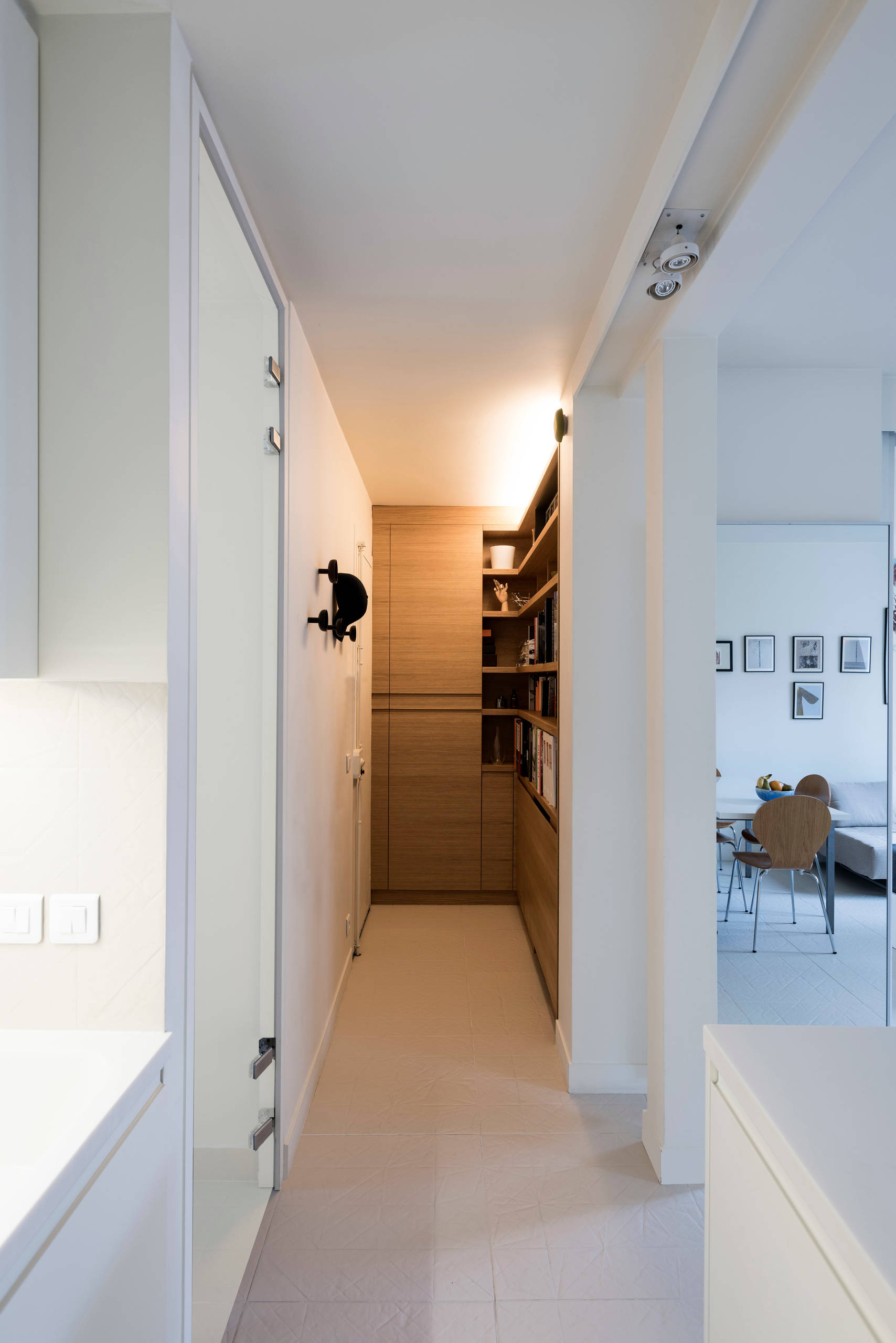 « Nous avons ajouté de la matière en créant une entrée intimiste et cosy dotée d’une élégante bibliothèque en chêne clair », nous livre Fabrizio. Cette structure abrite une penderie en partie haute et une série de rangements supplémentaires en partie basse.