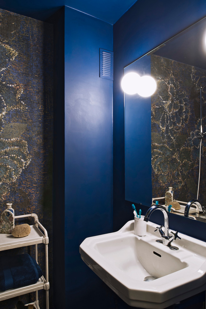 À l’image de la cuisine, la salle de bains se base sur le thème outremer. « Nous avons eu du mal à trouver le décor de cette pièce jusqu’à découvrir le concept du papier peint étanche. Les propriétaires ont tout de suite apprécié celui-ci », explique Olivier Bourdon.