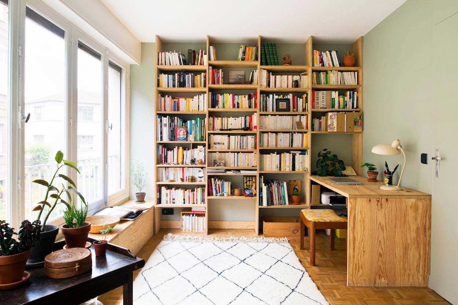 La seconde partie du double séjour a été aménagée en bibliothèque-bureau. C’était un impératif pour Cécile et Karim qui ont énormément de livres et sont amenés à travailler régulièrement à la maison. La bibliothèque a été fabriquée sur mesure en Batipin de 3 centimètres d’épaisseur par Jan Maes, un menuisier à la fibre artistique, peintre et sculpteur à ses heures. Attentif aux lignes de la pièce autant qu’au côté pratique de l’agencement, il a préconisé des étagères réglables, disposées légèrement en quinconce, et un bureau accolé dans le prolongement de la bibliothèque.