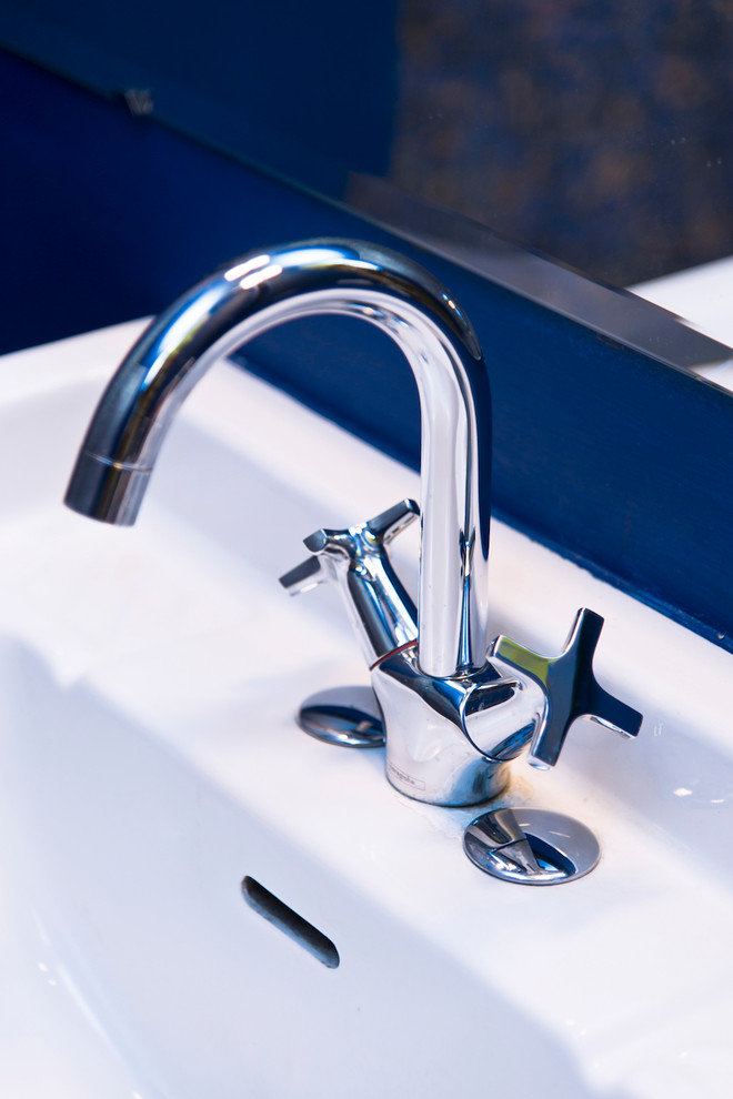 Le robinet très moderne, dessiné par le designer Citterio pour Axor, a été sélectionné pour son petit air rétro. Le thème vintage a été filé avec un miroir biseauté.