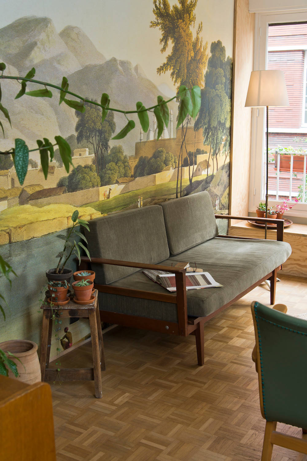 Pour compléter cette fresque murale réalisée avec des lés de papier peint, les murs se sont teintés d’un gris minéral. Au sol, le parquet mosaïque, typique des années 60, a été poncé puis traité au vernis mat pour faire ressortir son aspect blond.