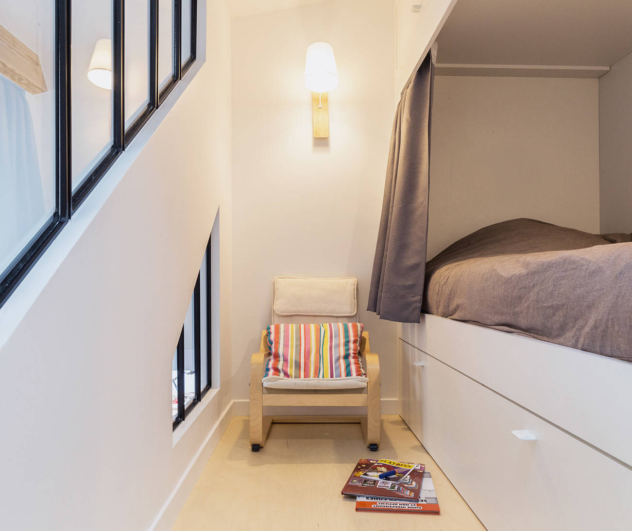 En mezzanine et entièrement ouverte, la chambre des enfants montre deux espaces distincts pensés comme des cabines de bateau ! Chaque enfant bénéficie de son propre coin nuit sur mesure en medium laqué blanc avec tiroirs et de la vue offerte par les verrières. Et chacun peut aussi tirer son rideau afin d’occulter son lit.