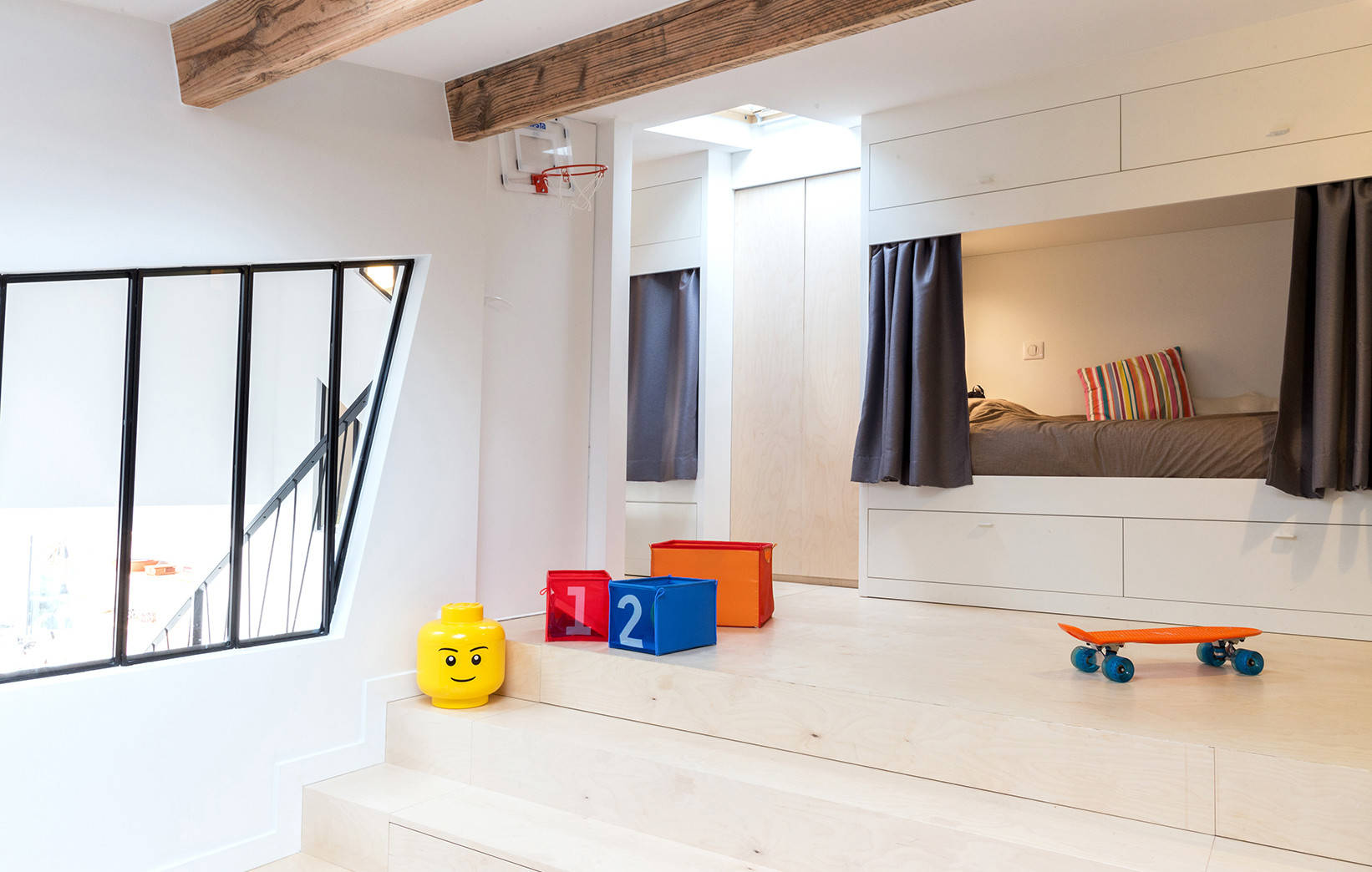 Entre les deux cabines, des placards en contreplaqué bouleau ont été réalisés et sont éclairés par la lumière de cette nouvelle petite fenêtre de toit. Ce matériau recouvre aussi le sol et ces marches sur mesure multifonctions. En effet, elles servent à relier la mezzanine existante et la nouvelle, mais sont aussi des tiroirs de rangement. Les marches près de la porte en haut de l’escalier constituent également un espace de jeu apprécié par les enfants !