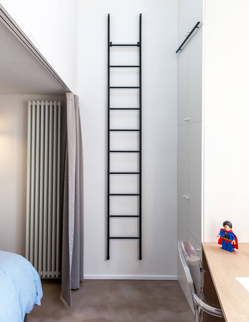 Chaque recoin du loft a été utilisé, à l’image de ces rangements sur mesure sur toute la hauteur du bâtiment. Ces dernier sont accessibles grâce à cette échelle métallique suspendue.