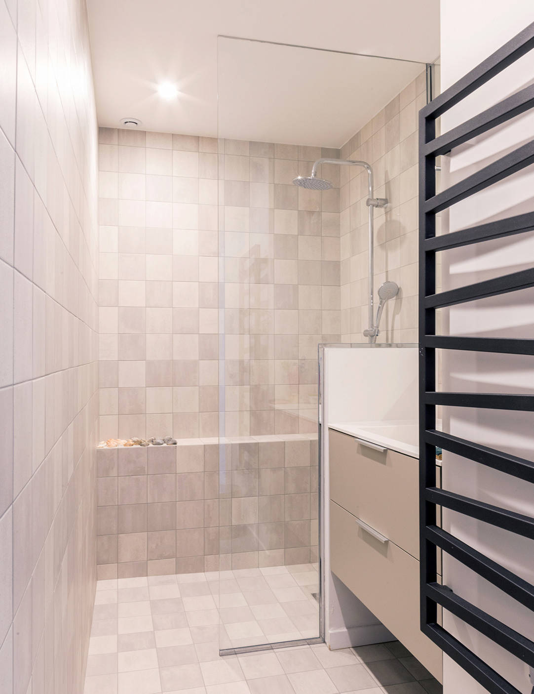 Quant à la salle de bains éclairée par l’une des verrières, son décor demeure sobre. Elle compte une grande douche à l’italienne carrelée avec une céramique en format 15 x 15 cm aspect pierre, un meuble vasque en résine et un sèche-serviettes électrique noir.