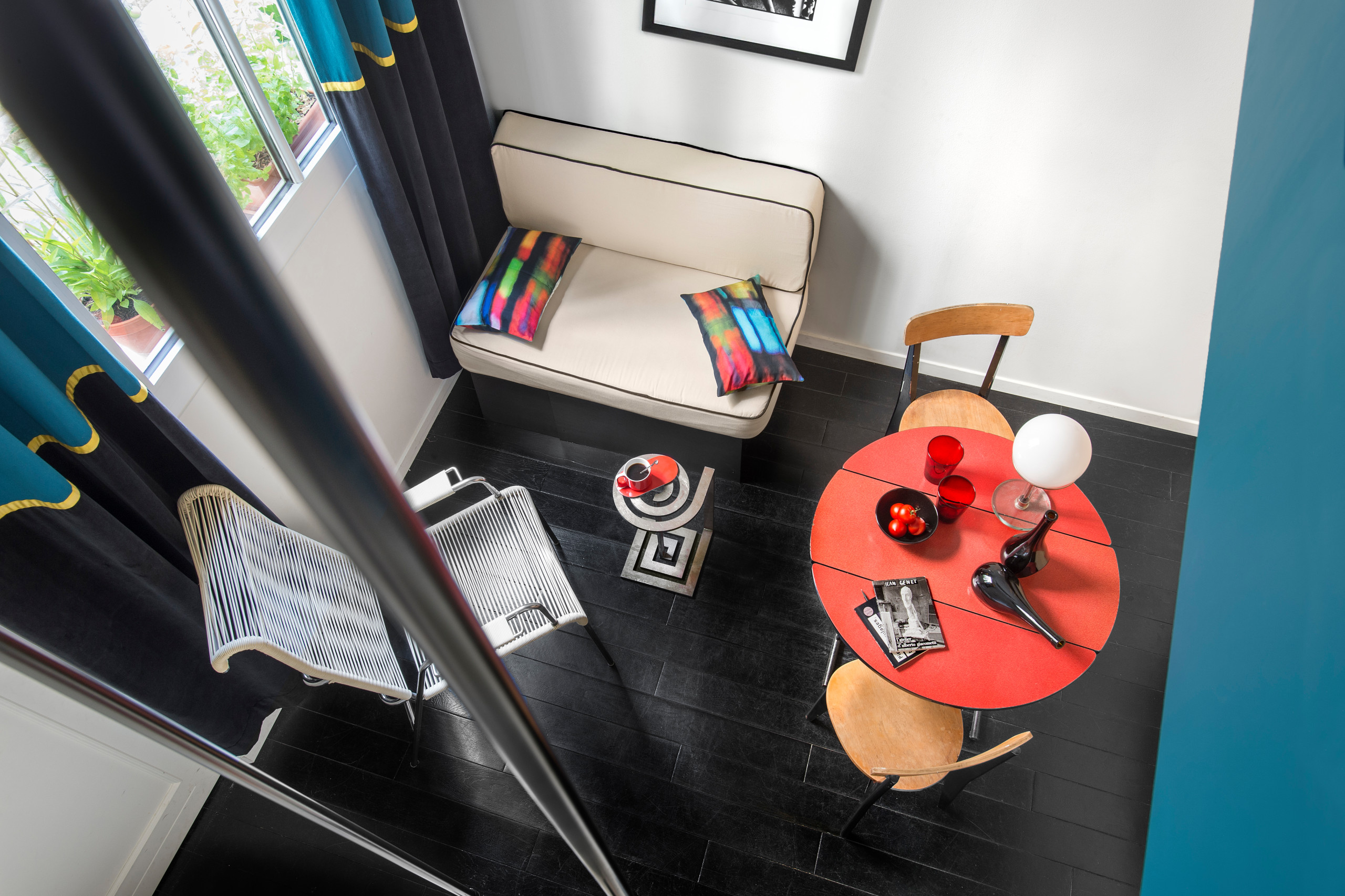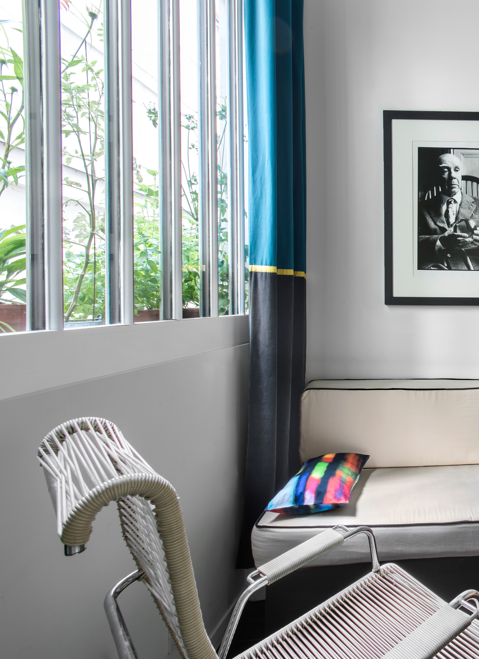 Côté déco comme en architecture, l’aménagement mixe réalisations sur mesure par Estelle GRIFFE, à l’instar de la table basse Zig Zag, pièces à petit prix avec notamment une banquette AMPM pour La Redoute, réveillée par un coussin Paris en été de chez Sentou, et meubles de style avec une table en formica et des chaises chinées façon Prouvé. À noter : la touche arty qui donne vie à l’ensemble avec un portrait de Borges signé Gerard Malanga déniché dans la galerie Sandrine Mons.