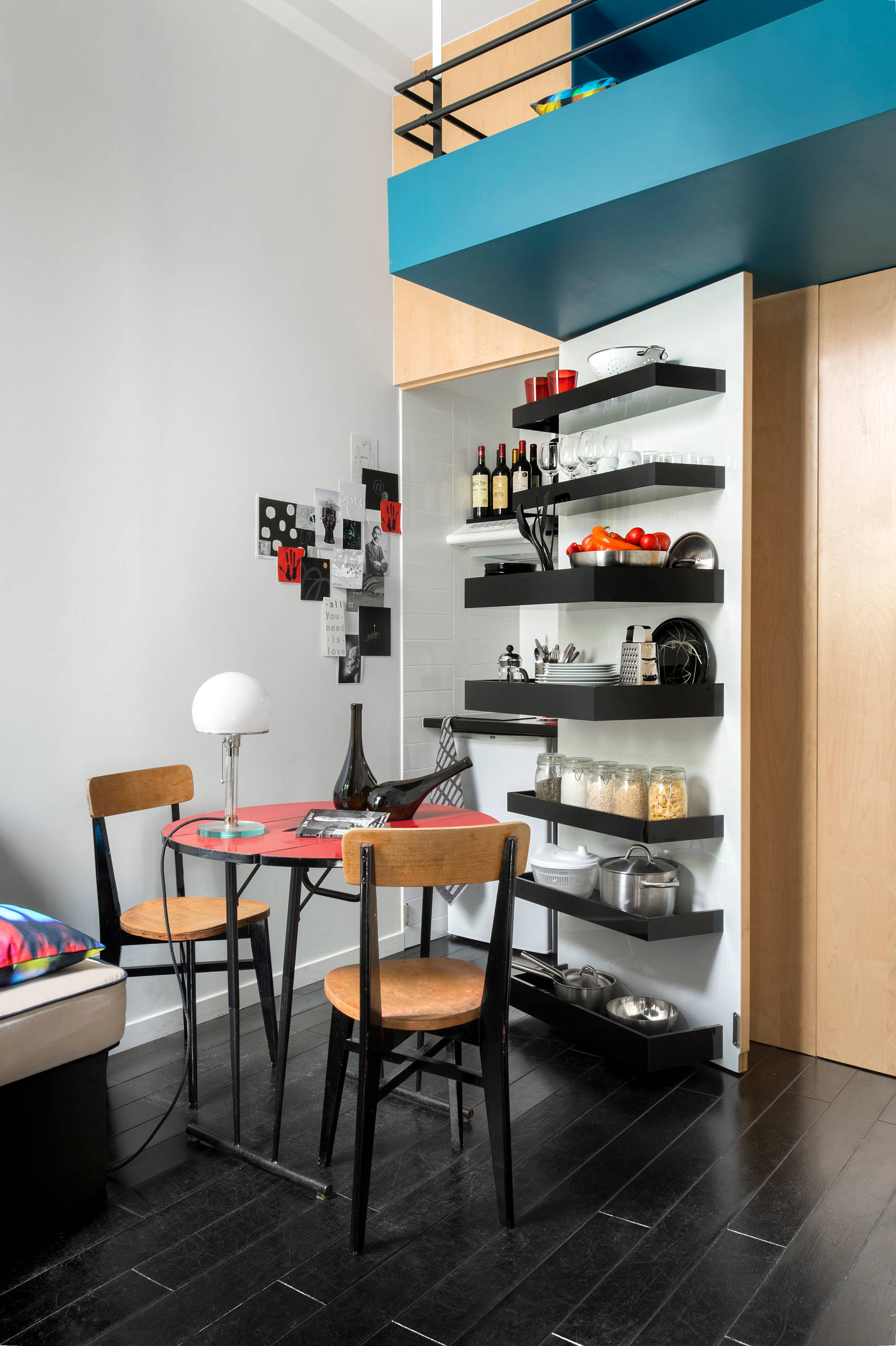 Seconde démonstration de cette philosophie du vide nécessaire avec la mezzanine. Réduite à la dimension du couchage, un minimum confortable de 140 cm, cette dernière permet de dégager un espace au-dessus de la cuisine et d’aérer notablement l’ensemble de la réalisation.