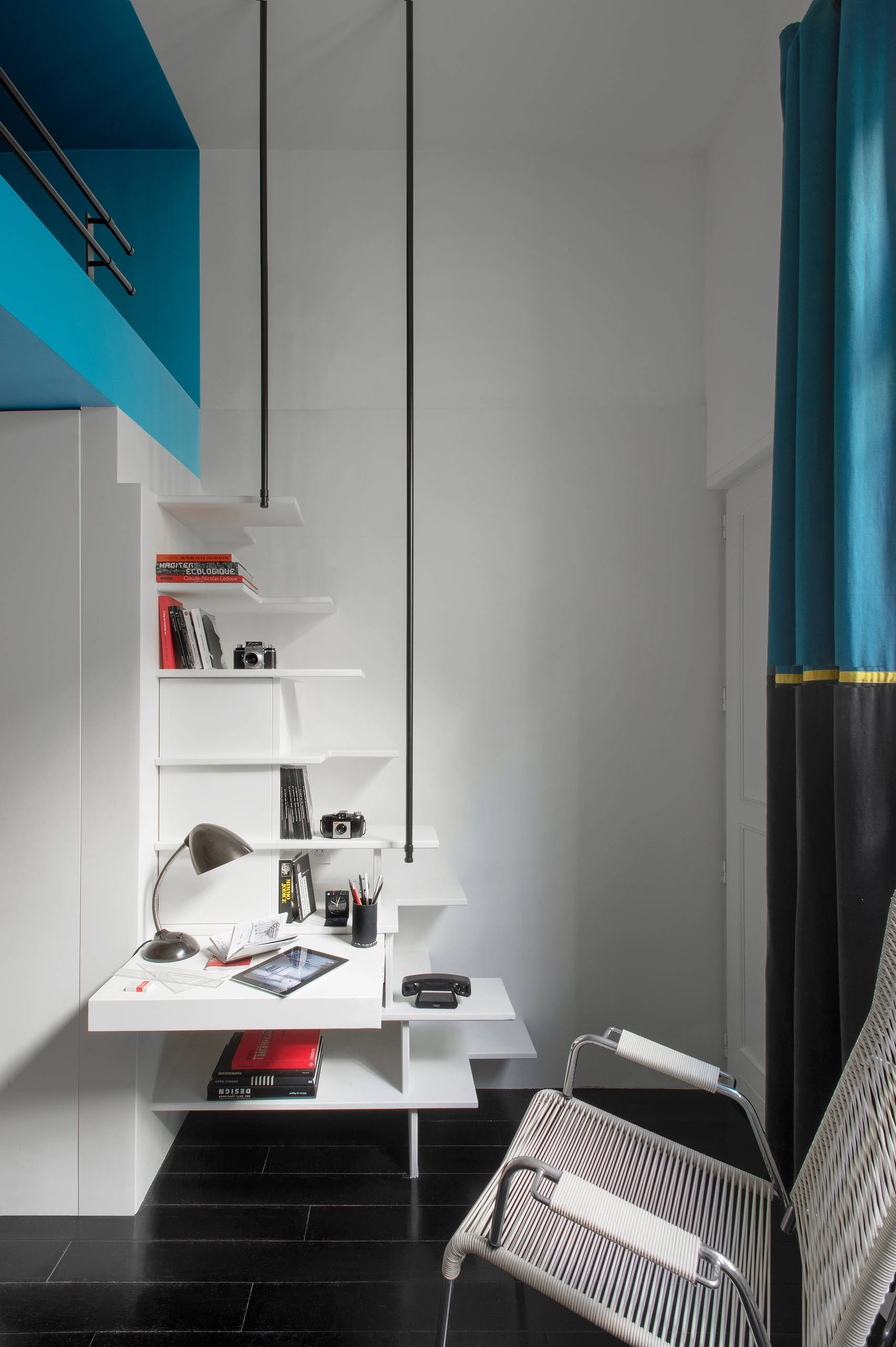 Une réflexion sur l’économie de chaque centimètre carré qui ne se fait pas au détriment du confort d’utilisation, comme le souligne joliment Estelle : « Ne pas renoncer au superflu, chose si nécessaire, disait Voltaire dans un autre contexte, mais qui s’applique ici merveilleusement à la mathématique de l’espace et du vide. » Ainsi, plutôt qu’une échelle de meunier, qui offrirait pourtant un encombrement minimal au sol mais un équilibre précaire, l’architecte a imaginé un escalier à pas japonais dont le design minimaliste dissimule un bureau et des rangements parfaitement intégrés.