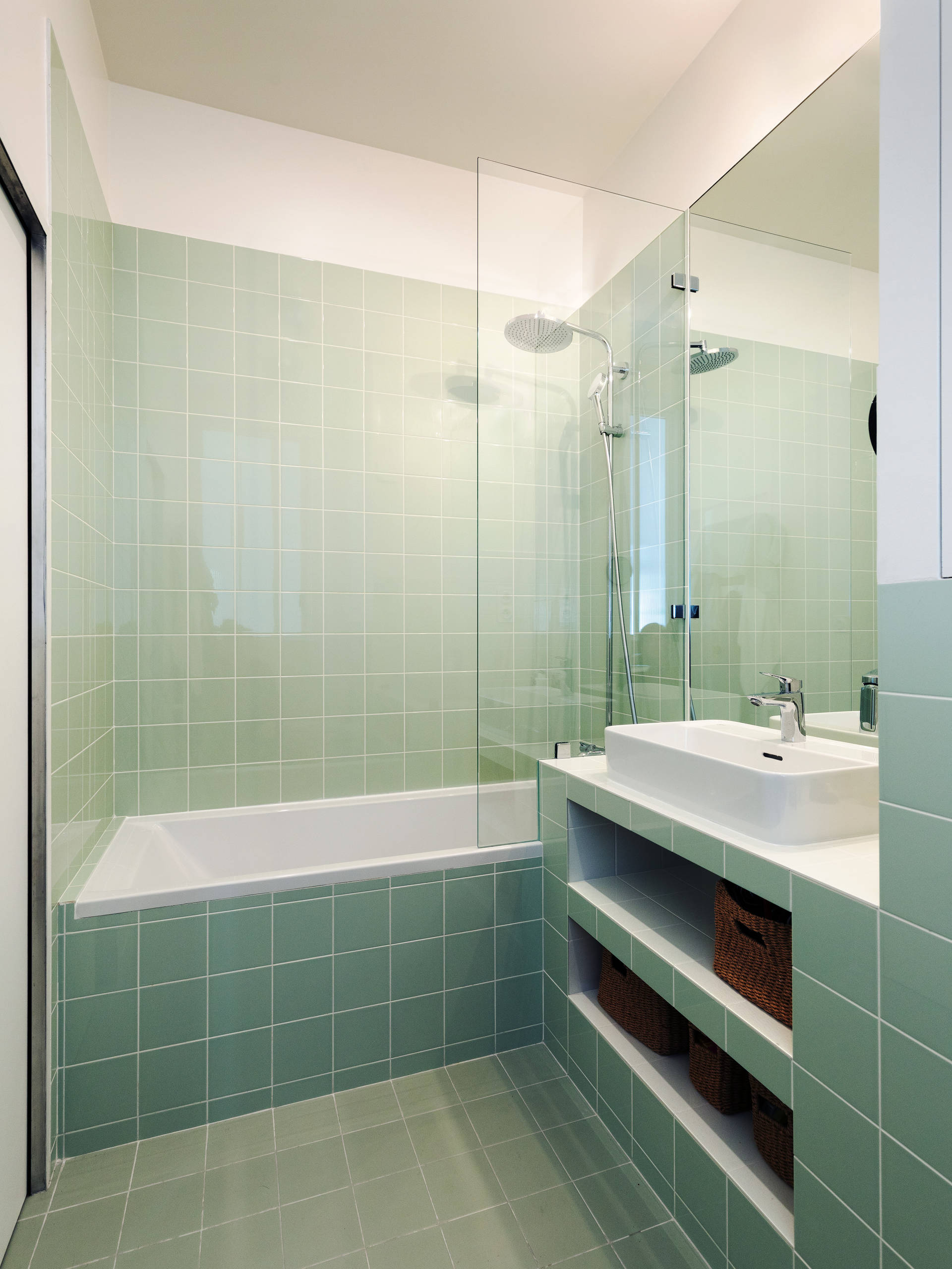 « Nous avons joué sur la géométrie de la salle de bains en travaillant sur des harmonies de couleurs avec différentes références de carrelage dans des tons de blanc et de vert pour un look graphique et contemporain », précise Claire Arnaud.