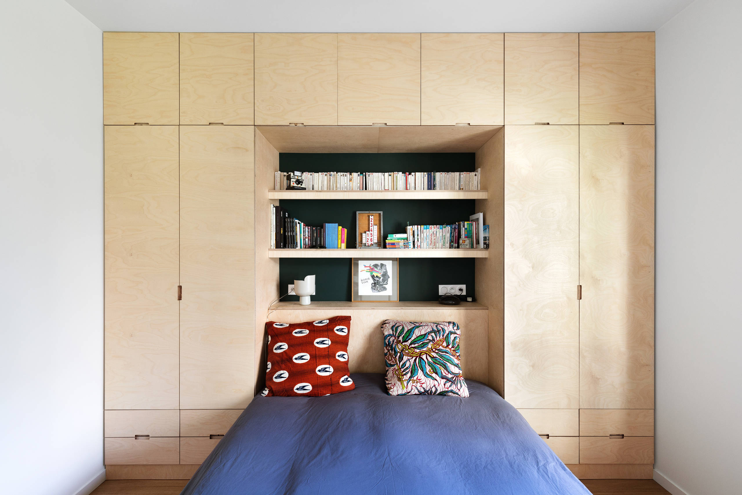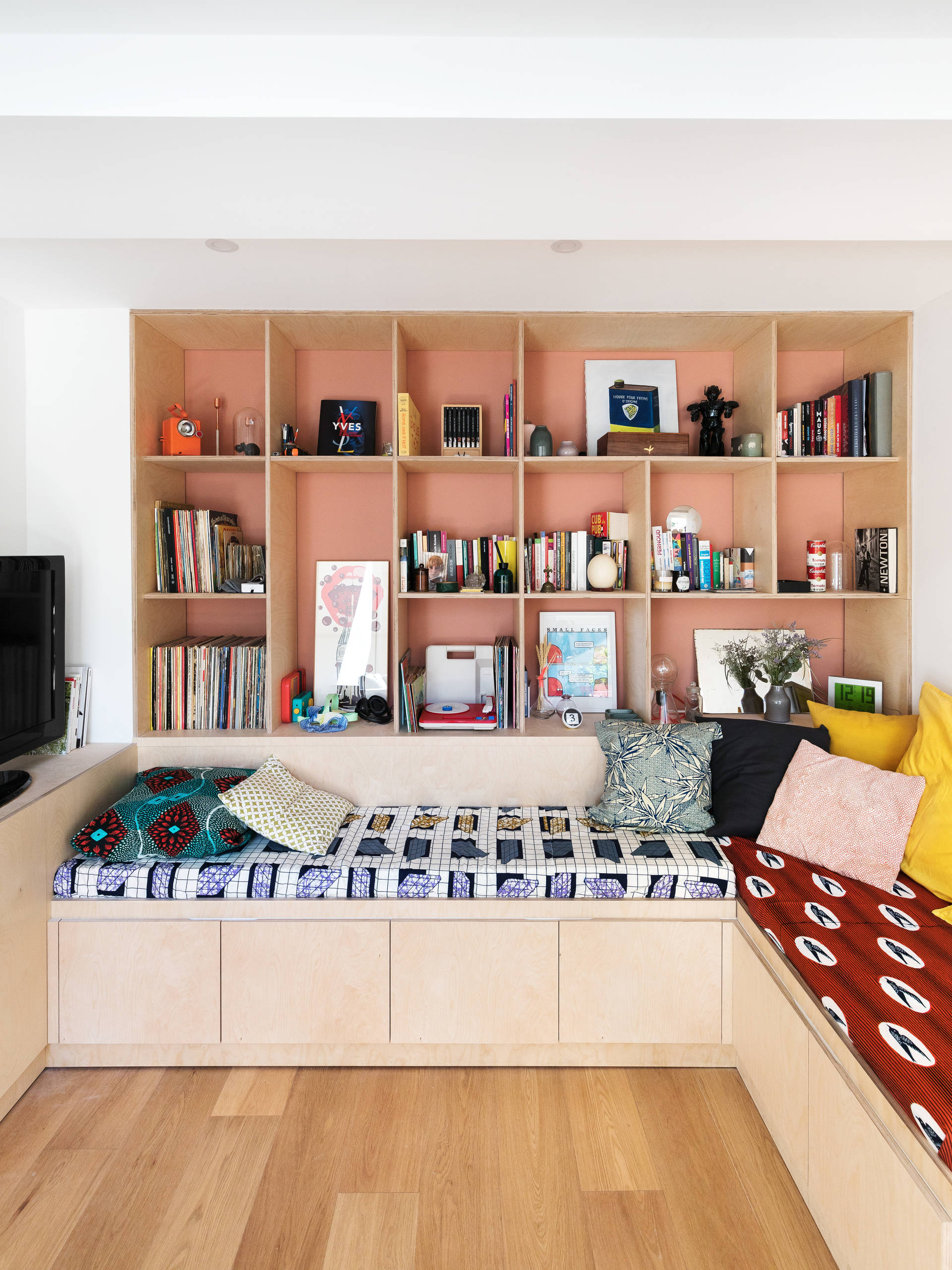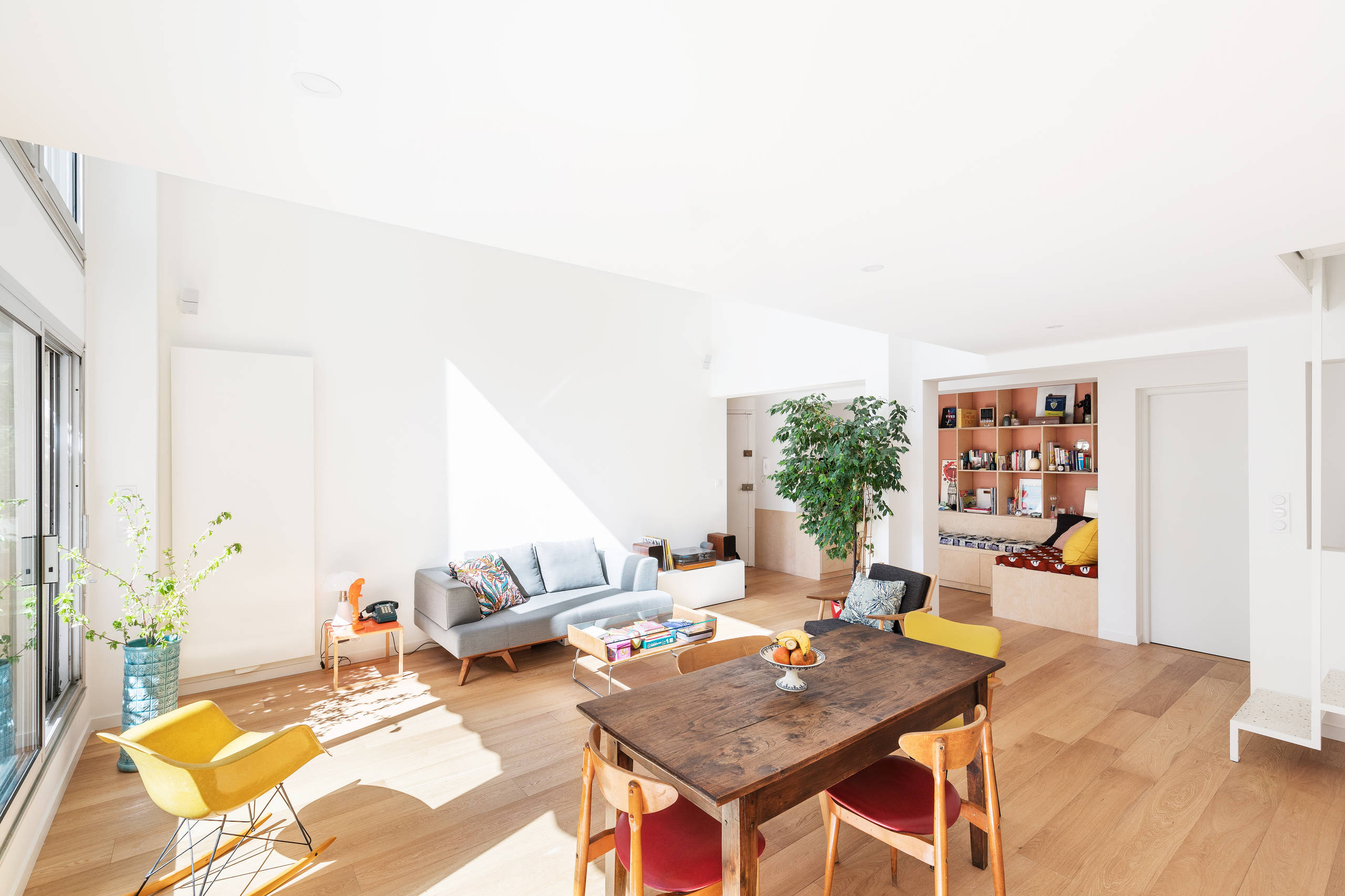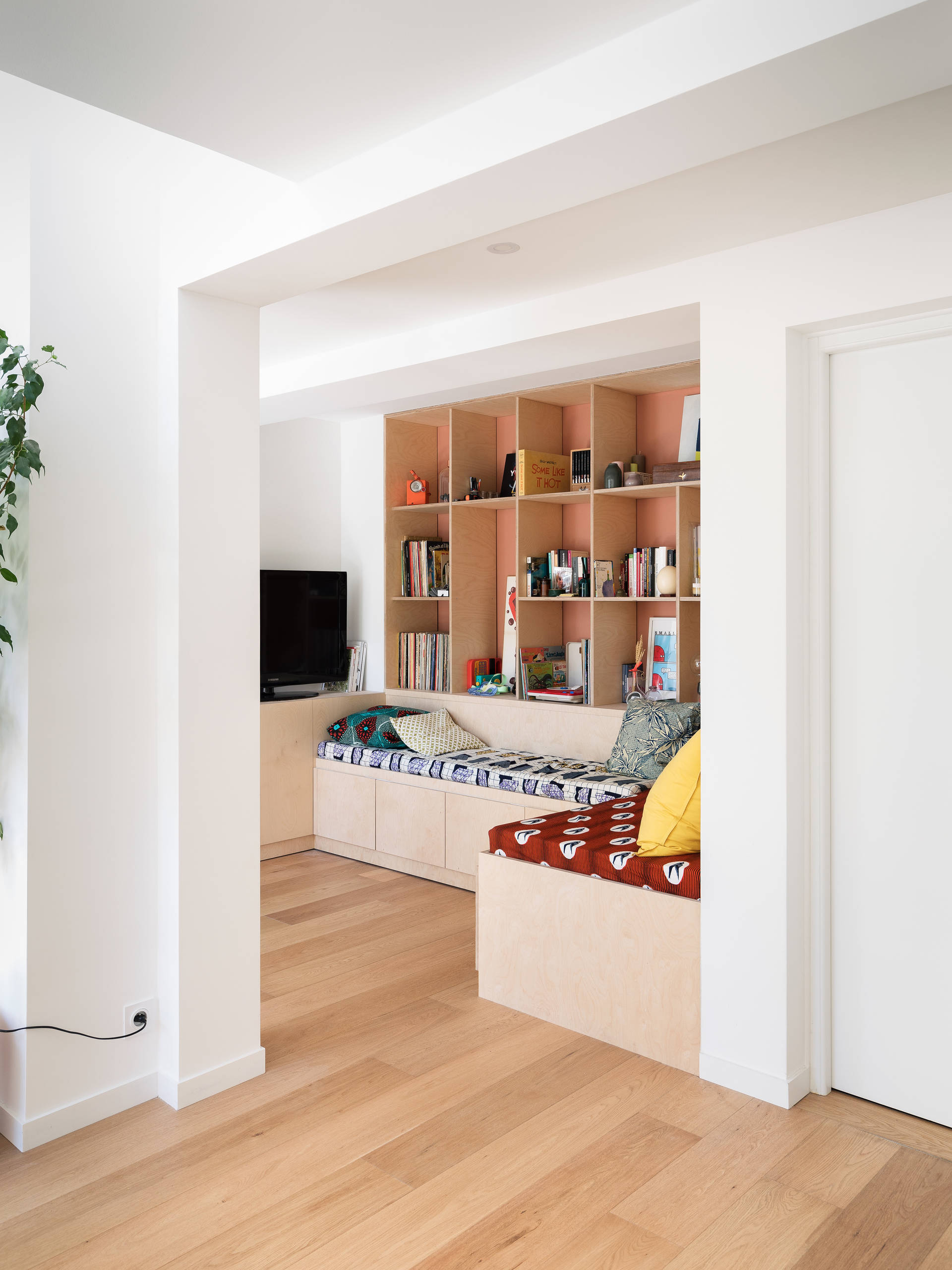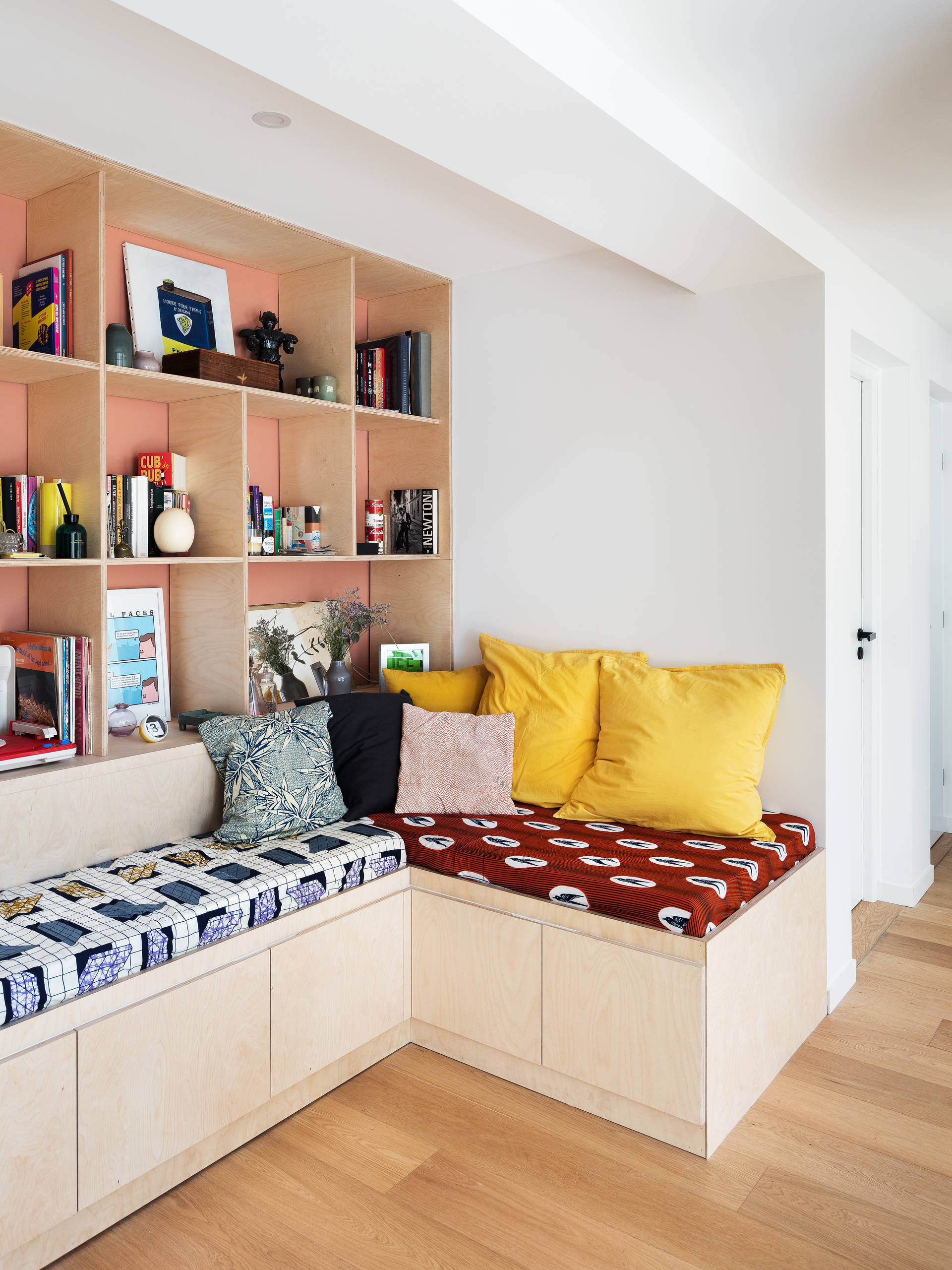 Une grande bibliothèque réalisée sur-mesure habille le mur du fond. Conçue en contreplaqué de bouleau, cette structure s’associe à une peinture d’une teinte terracotta légèrement rosée.