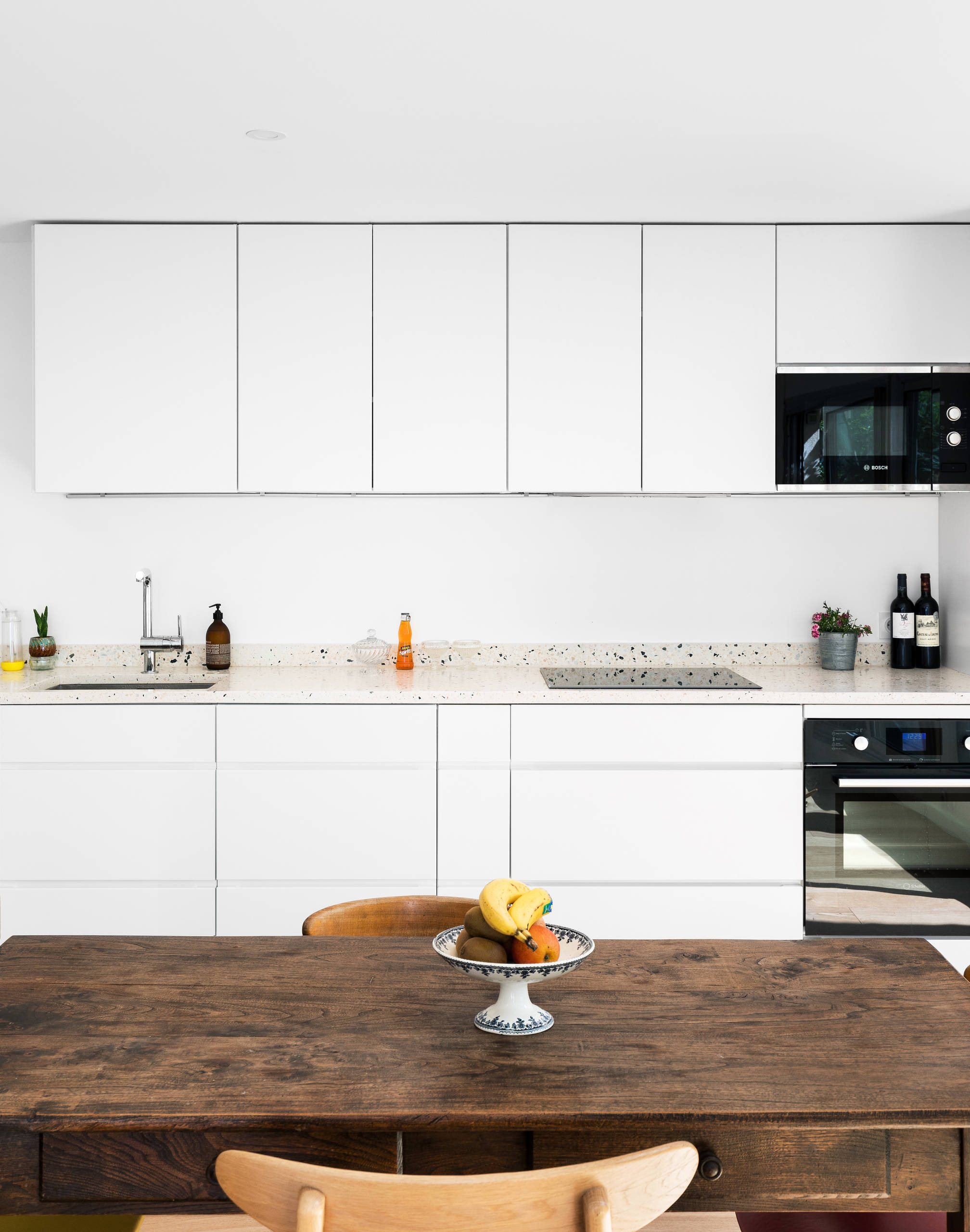 Le mobilier de cuisine a été choisi dans un blanc mat pour un look sobre et épuré, qui contraste avec la table en bois vintage et les chaises dépareillées de l’espace salle à manger.
