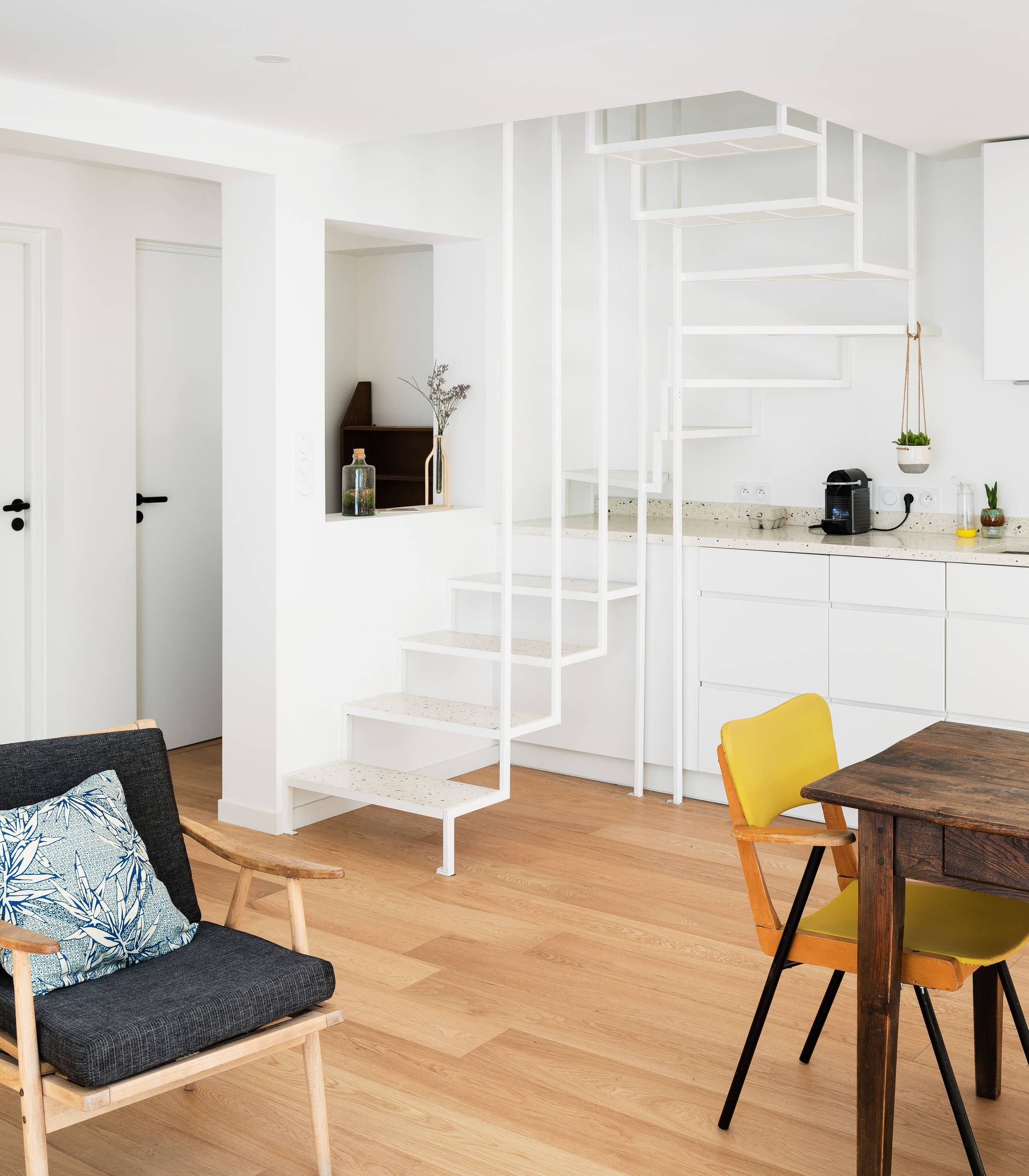 « L’idée était de créer un escalier léger et compact pour ne pas perturber la lecture de l’espace. Nous sommes partis sur un escalier en métal laqué blanc qui s’intègre bien dans ce volume », précise l’architecte.